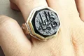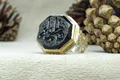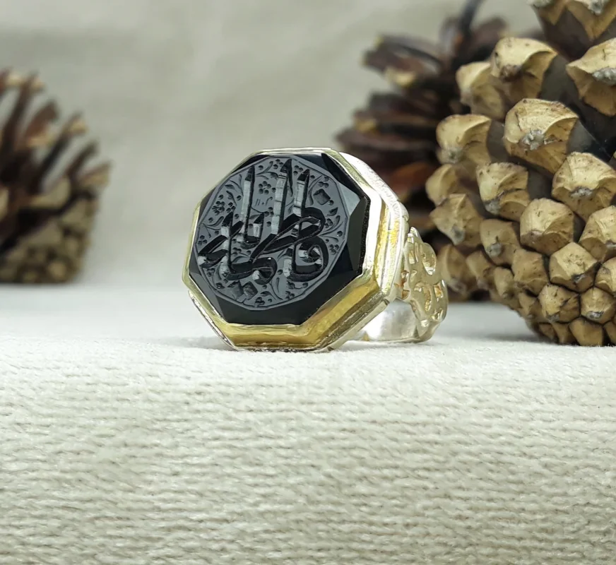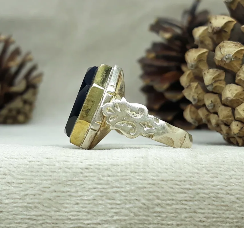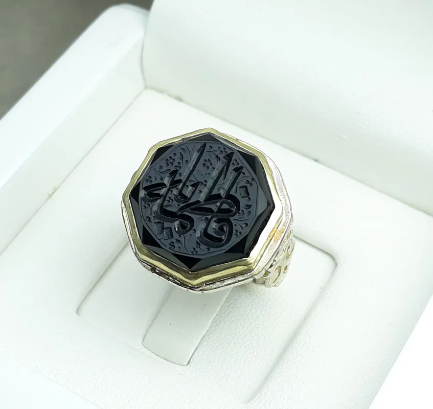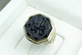 انگشتر نقره عقیق مشکی حکاکی یا فاطمه رکاب تاج برنجی هشت ضلعی