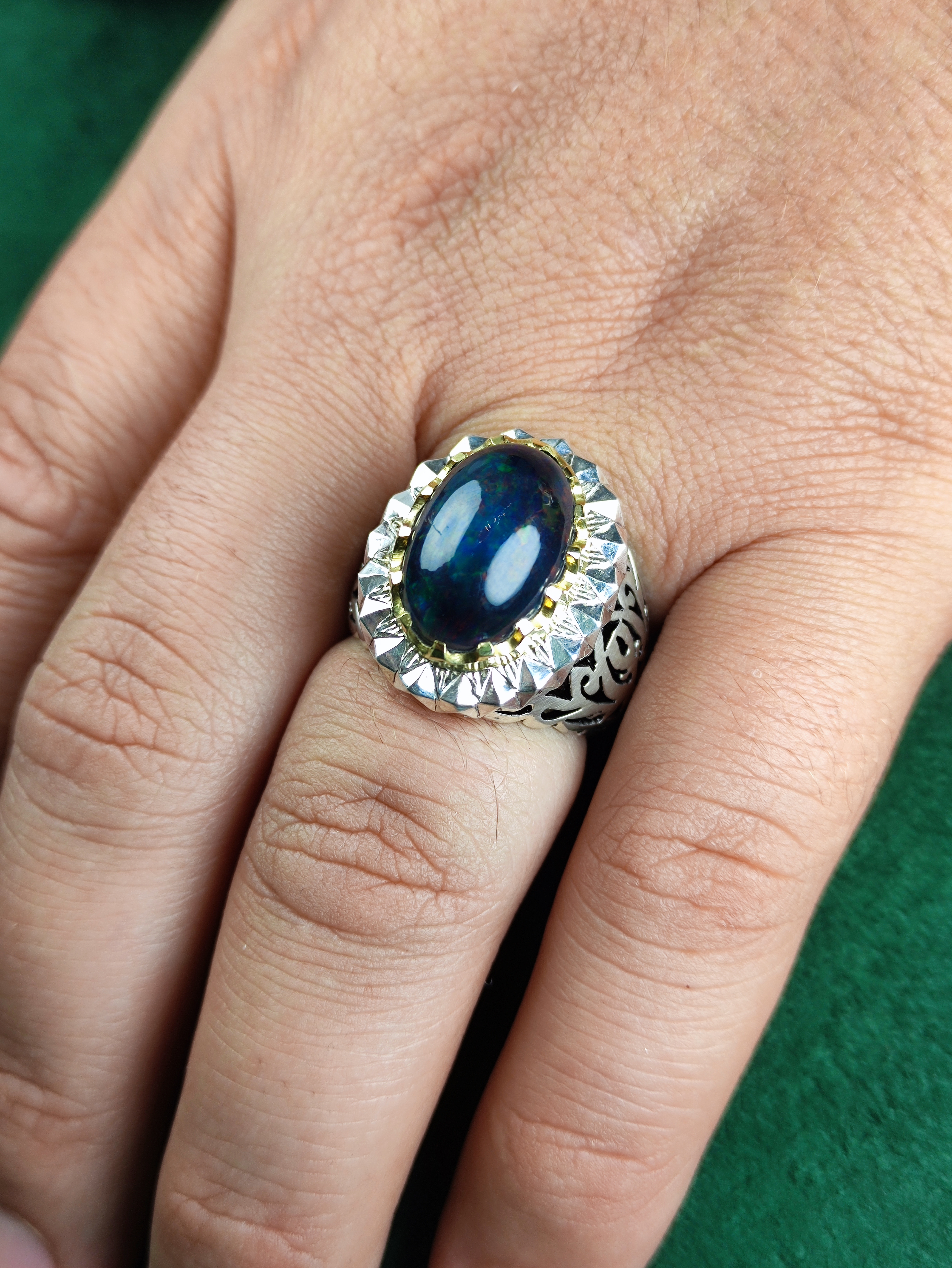 انگشتر نقره اپال اتیوپی اصل با تلألو سبز و قرمز رکاب فیلی چنگی دست ساز شبکه و آینه کاری شده