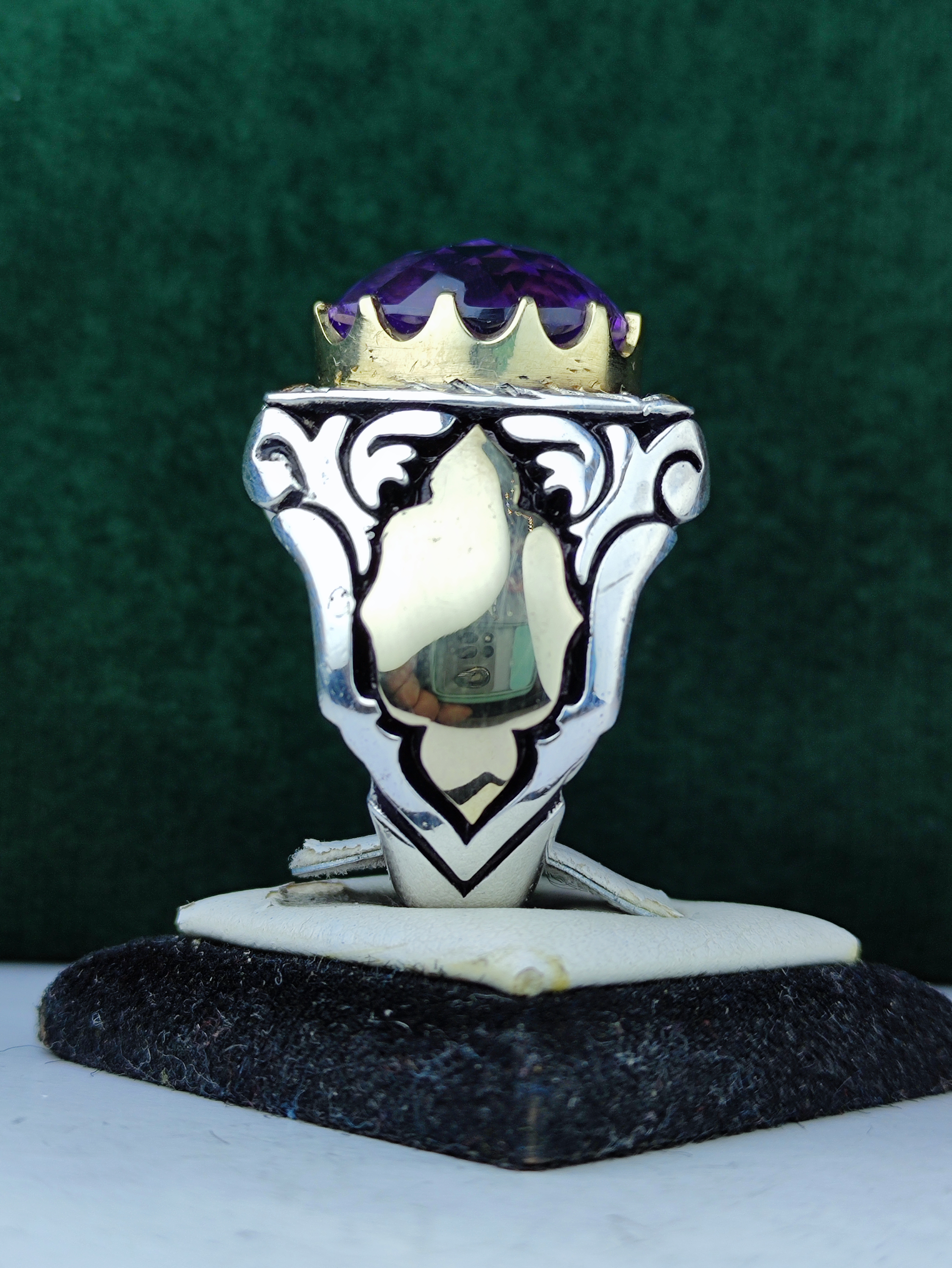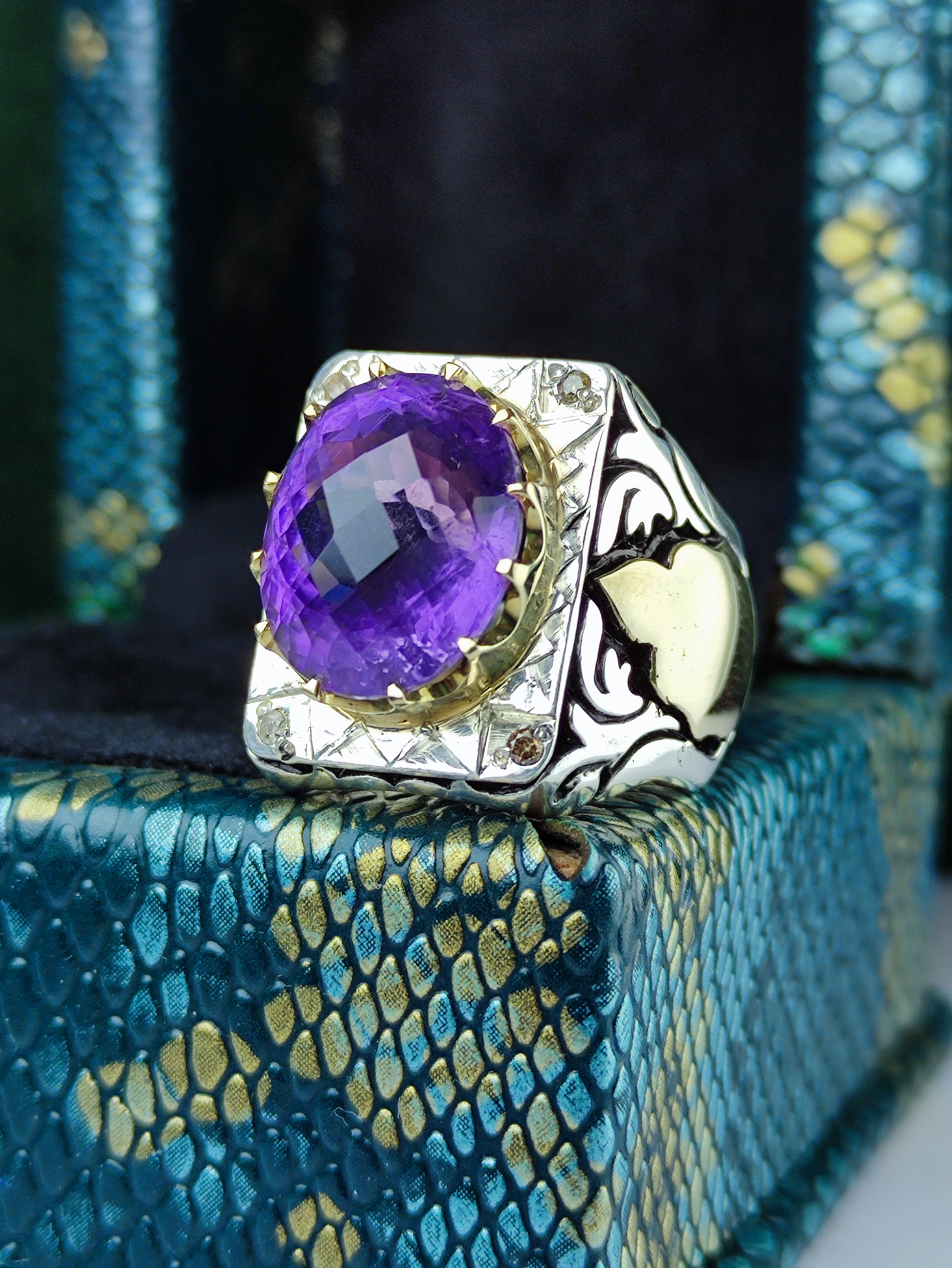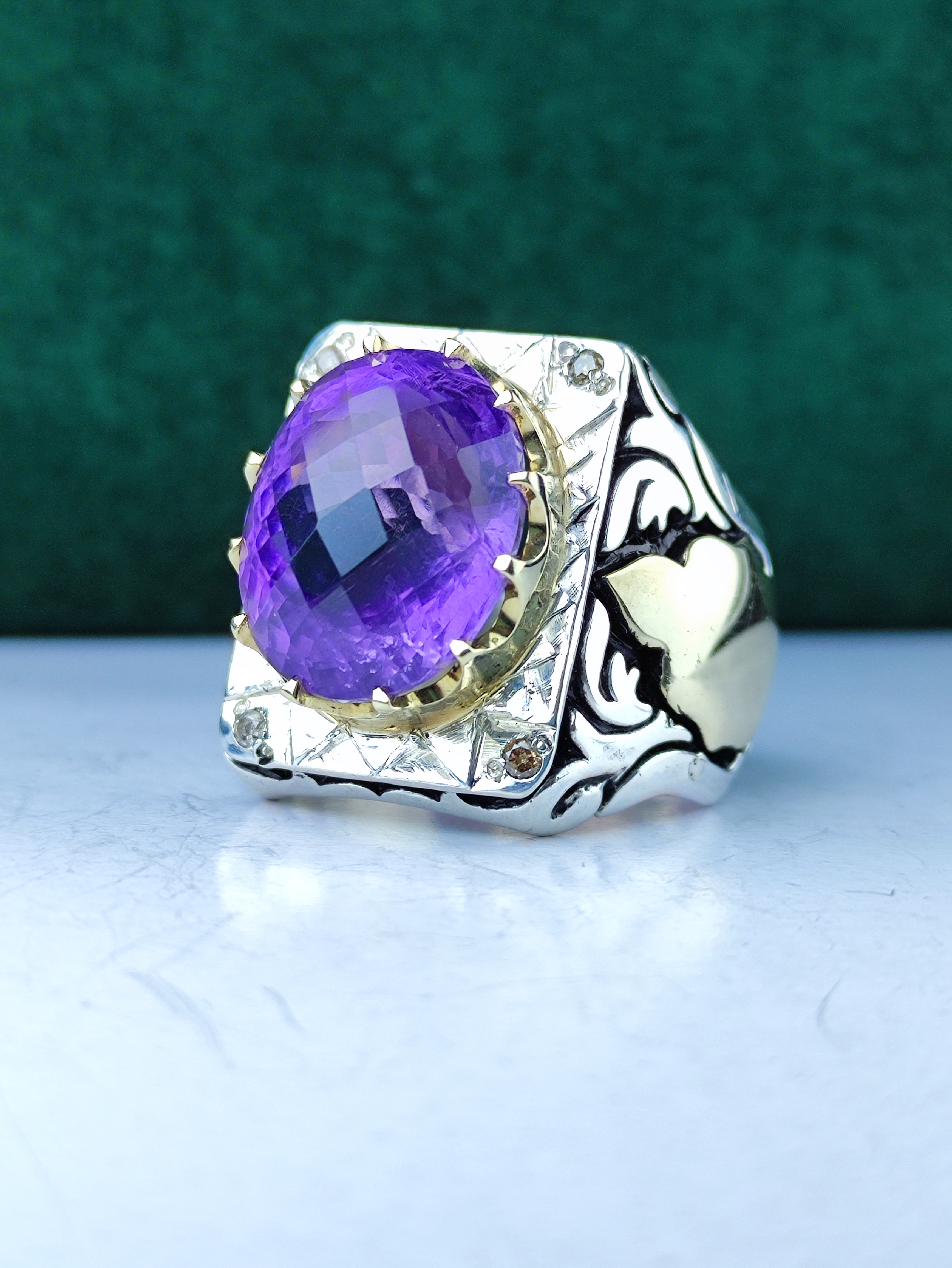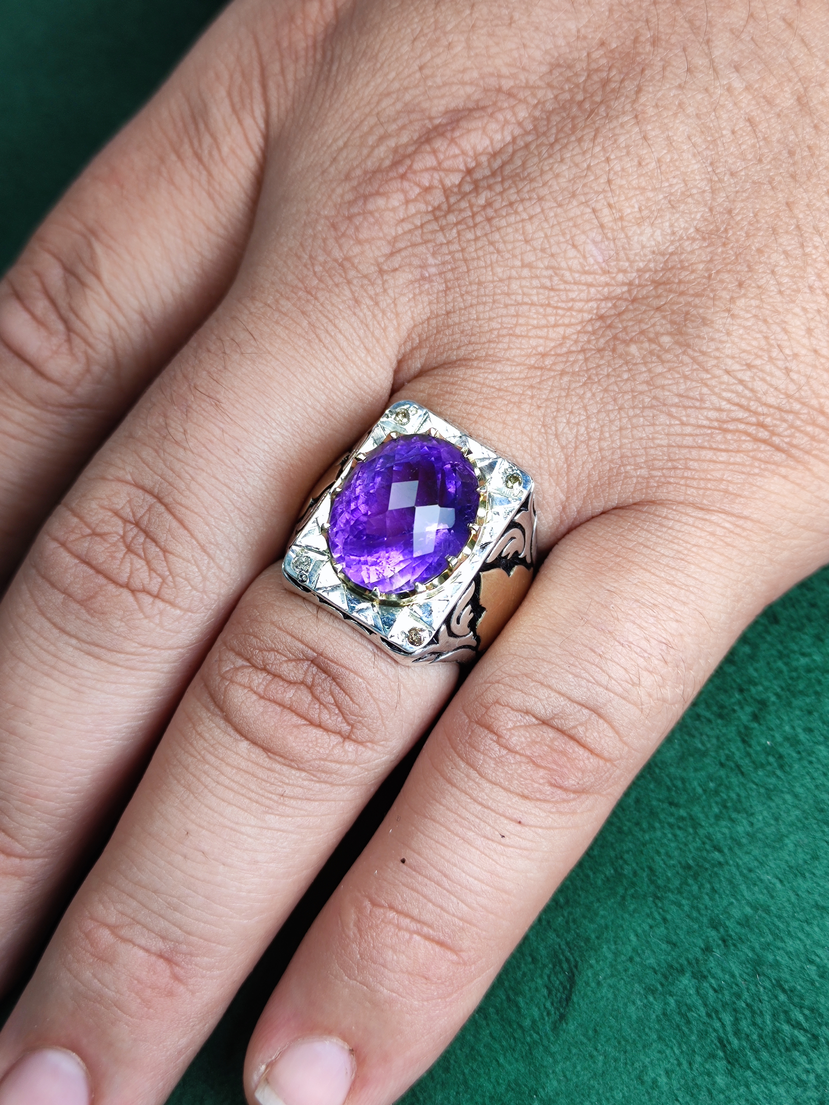 با انگشتر نقره آماتیس اصل، جواهرات خود را خیرهکننده کنید! این انگشتر با سنگ آماتیس فنسی تراش و چهار قطعه برلیان اصلی، جذابیت و درخشش ویژهای به دستان شما میبخشد. رکاب فیلی چنگی و آینهکاری دقیق، هنر دست و ماشین در نهایت زیبایی و جلال را به نمایش گذاشته است. فرصت را از دست ندهید و به کلکسیون خود شکوهی بینظیر بیفزایید!