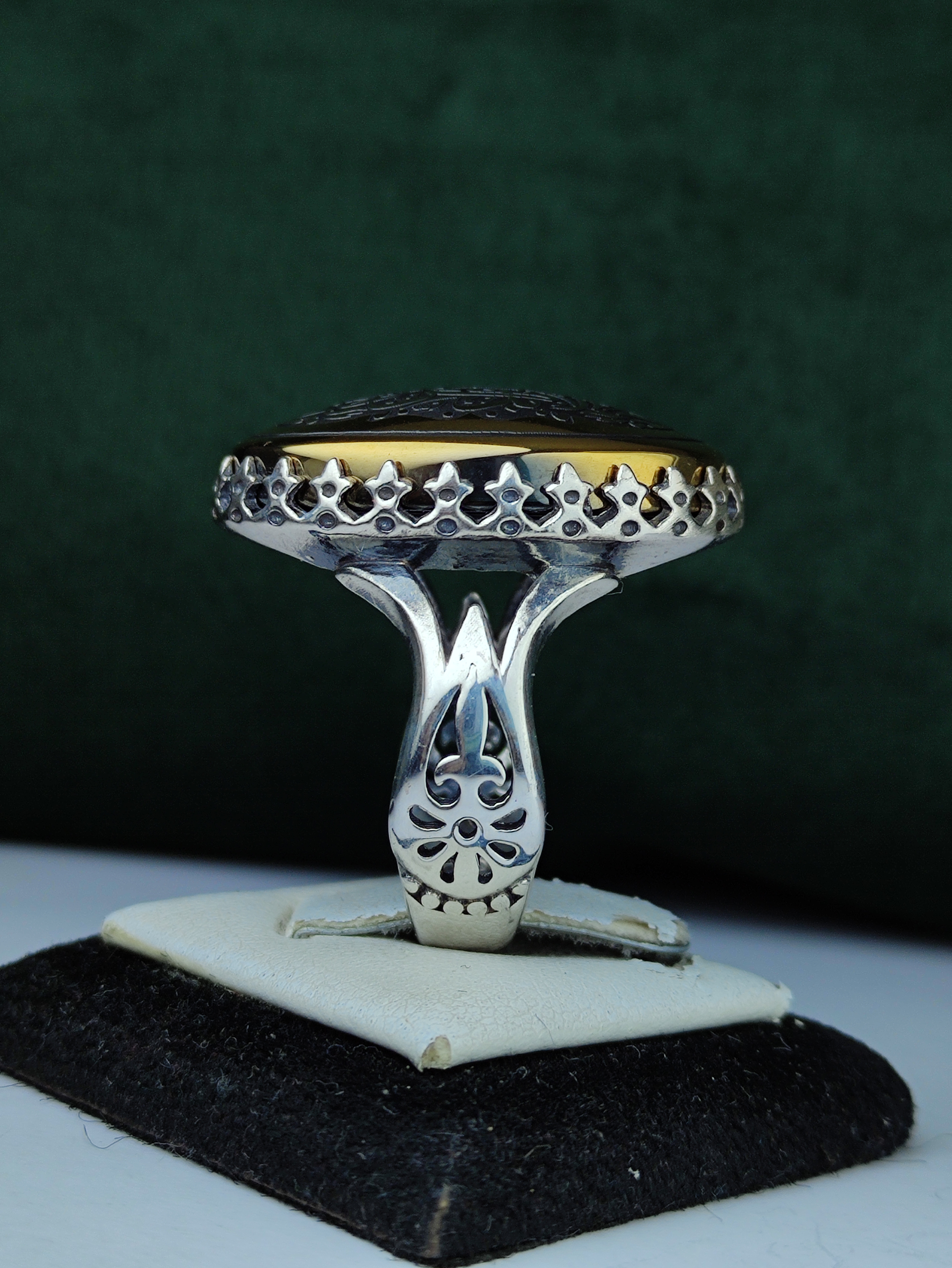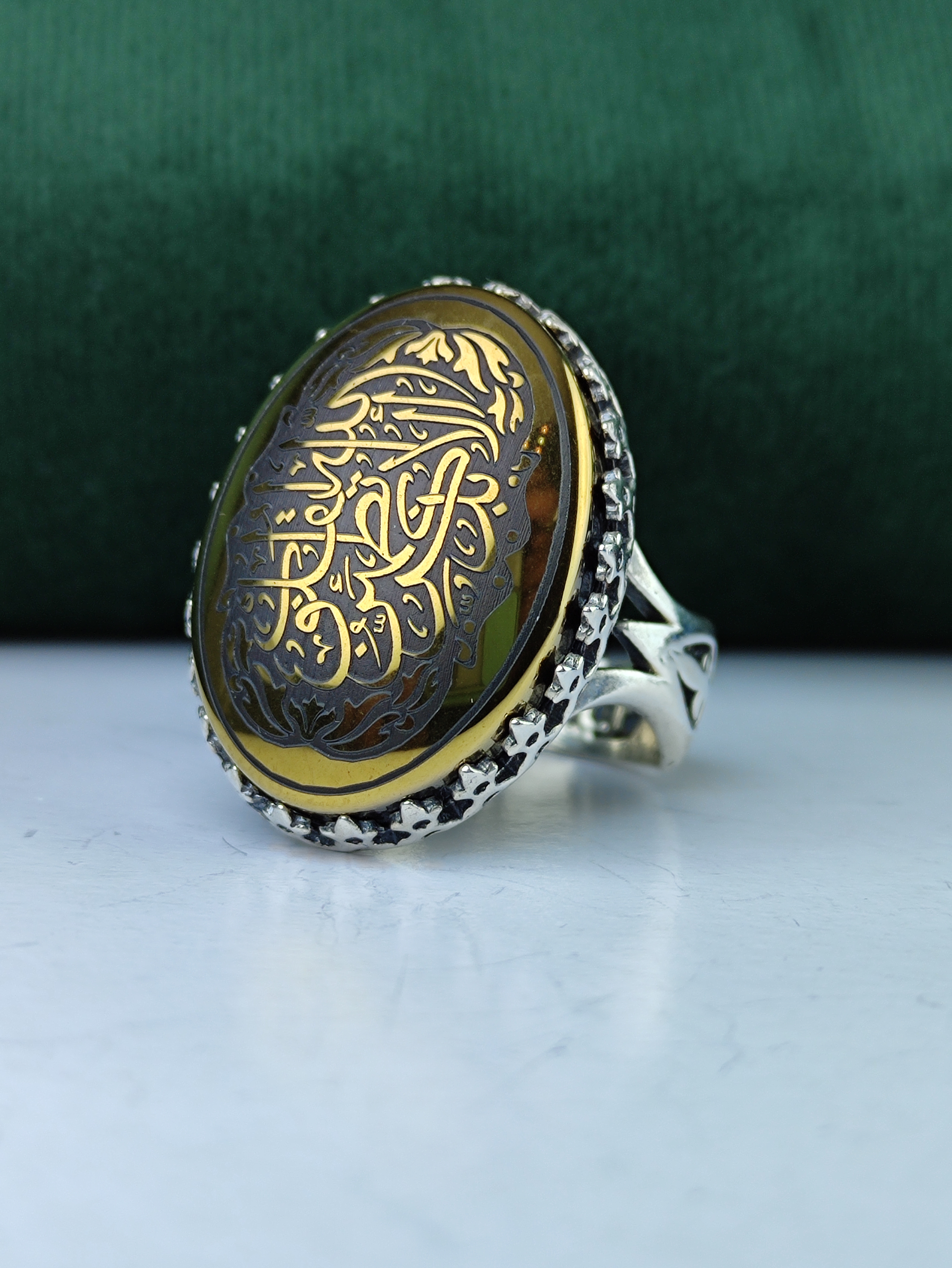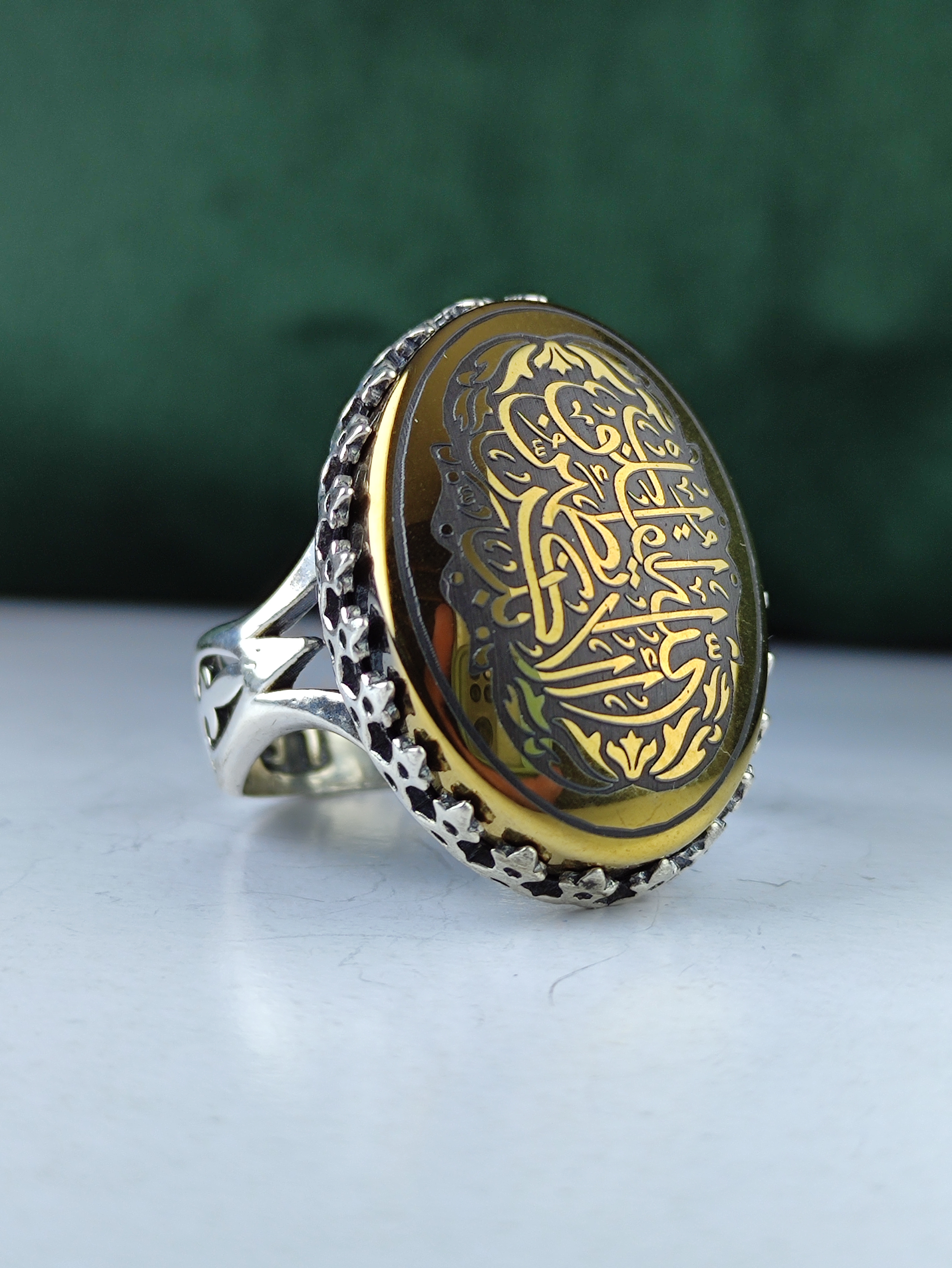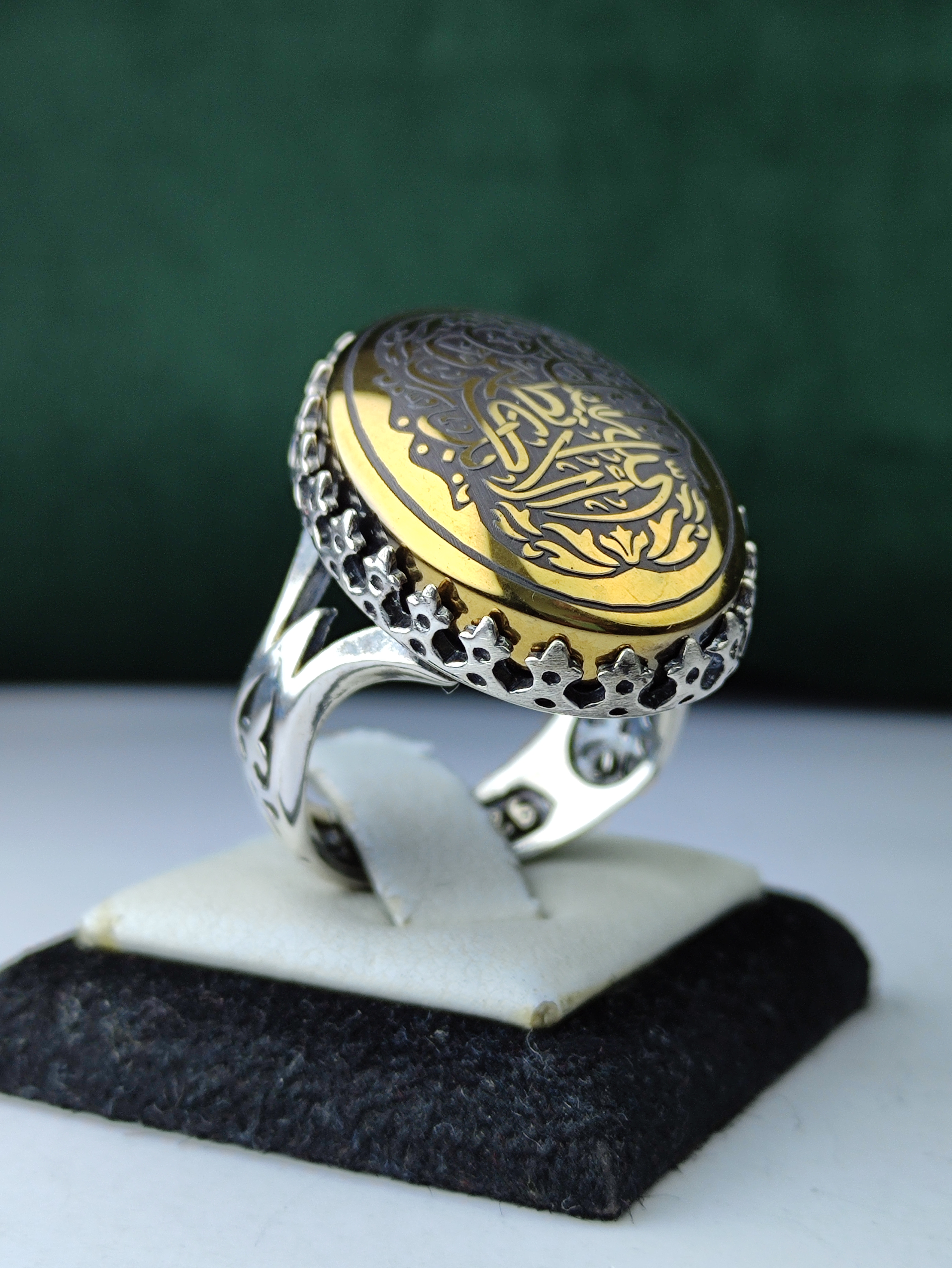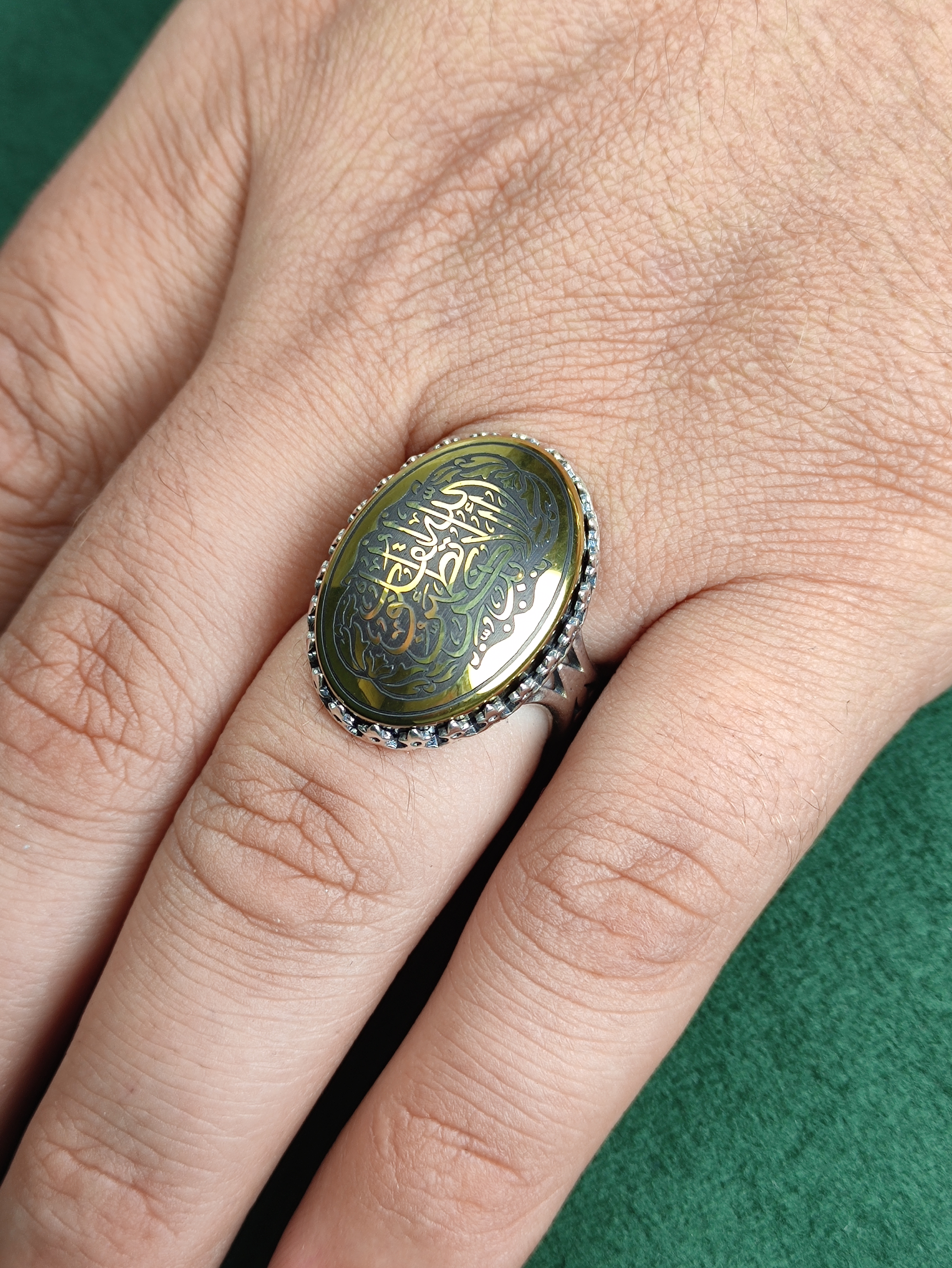 با انگشتر نقره حدید طلایی اصل حکاکیشده با عبارت آرامشبخش "أَلا بِذِكْرِ اللَّهِ تَطْمَئِنُّ الْقُلُوبُ"، جذابیت و معنویت را همزمان تجربه کنید. رکاب صفوی چنگی این انگشتر، ترکیبی از هنر و اصالت را به ارمغان میآورد. گزینهای ایدهآل برای علاقهمندان به استایل خاص و کلاسیک!