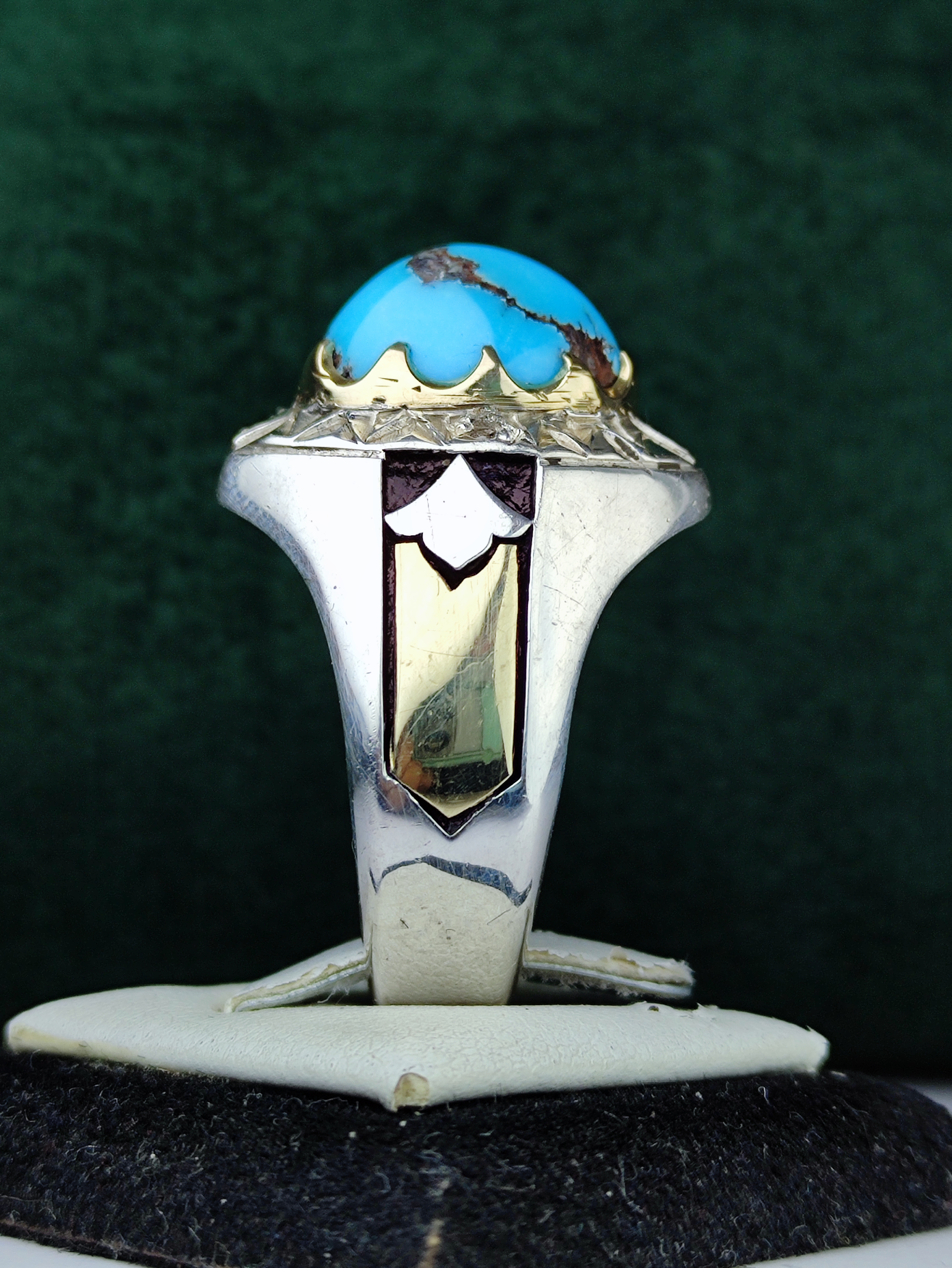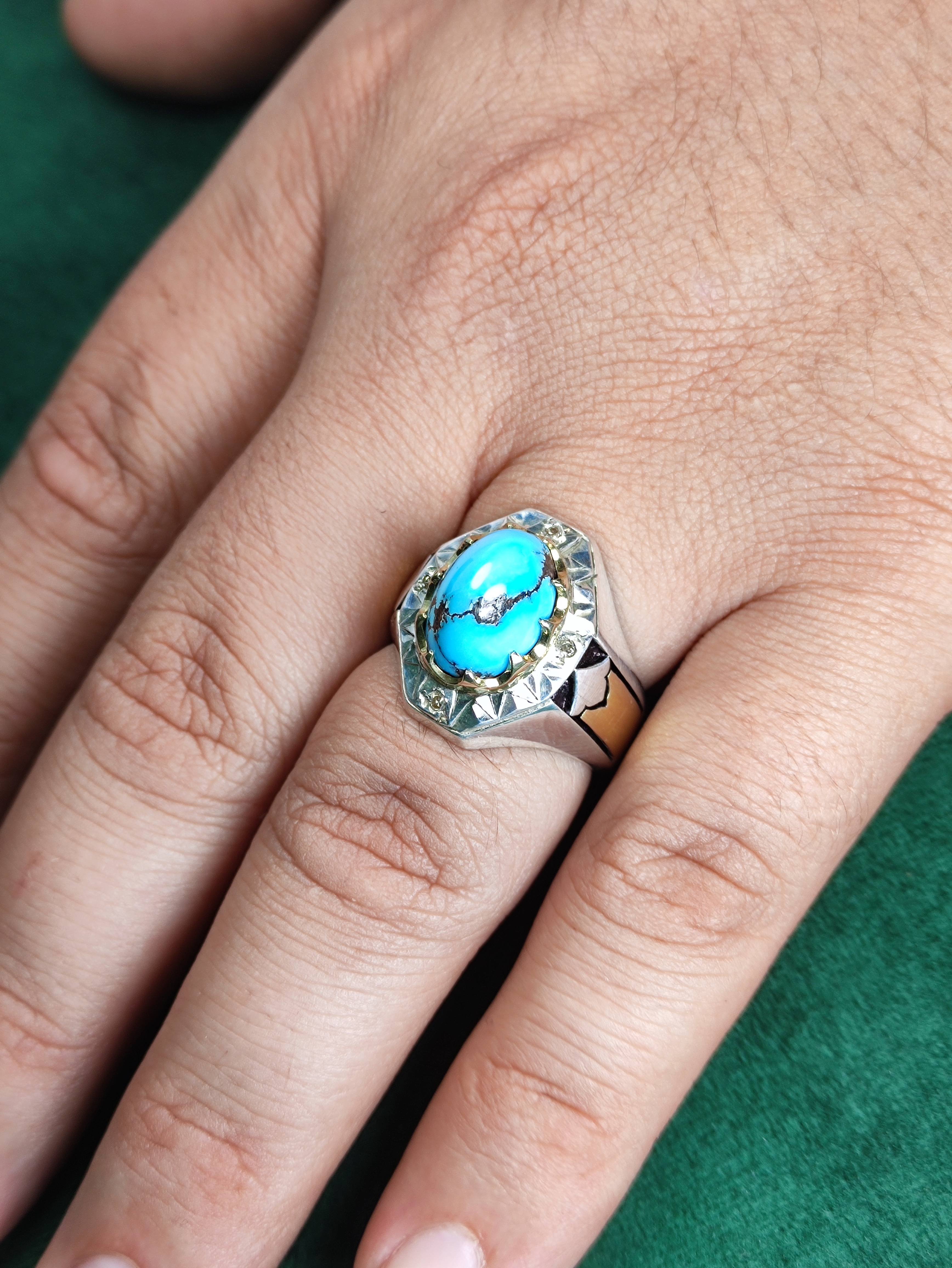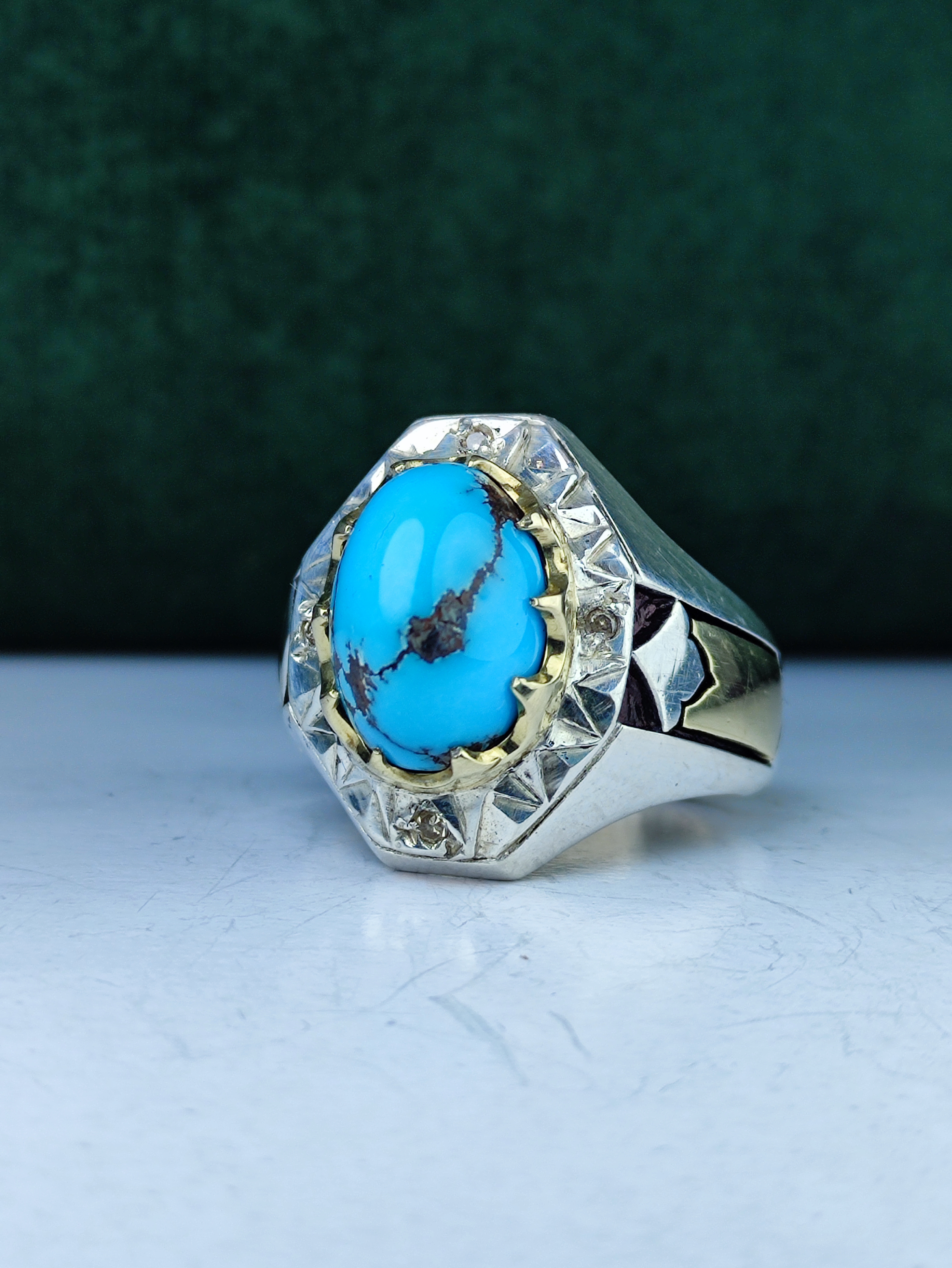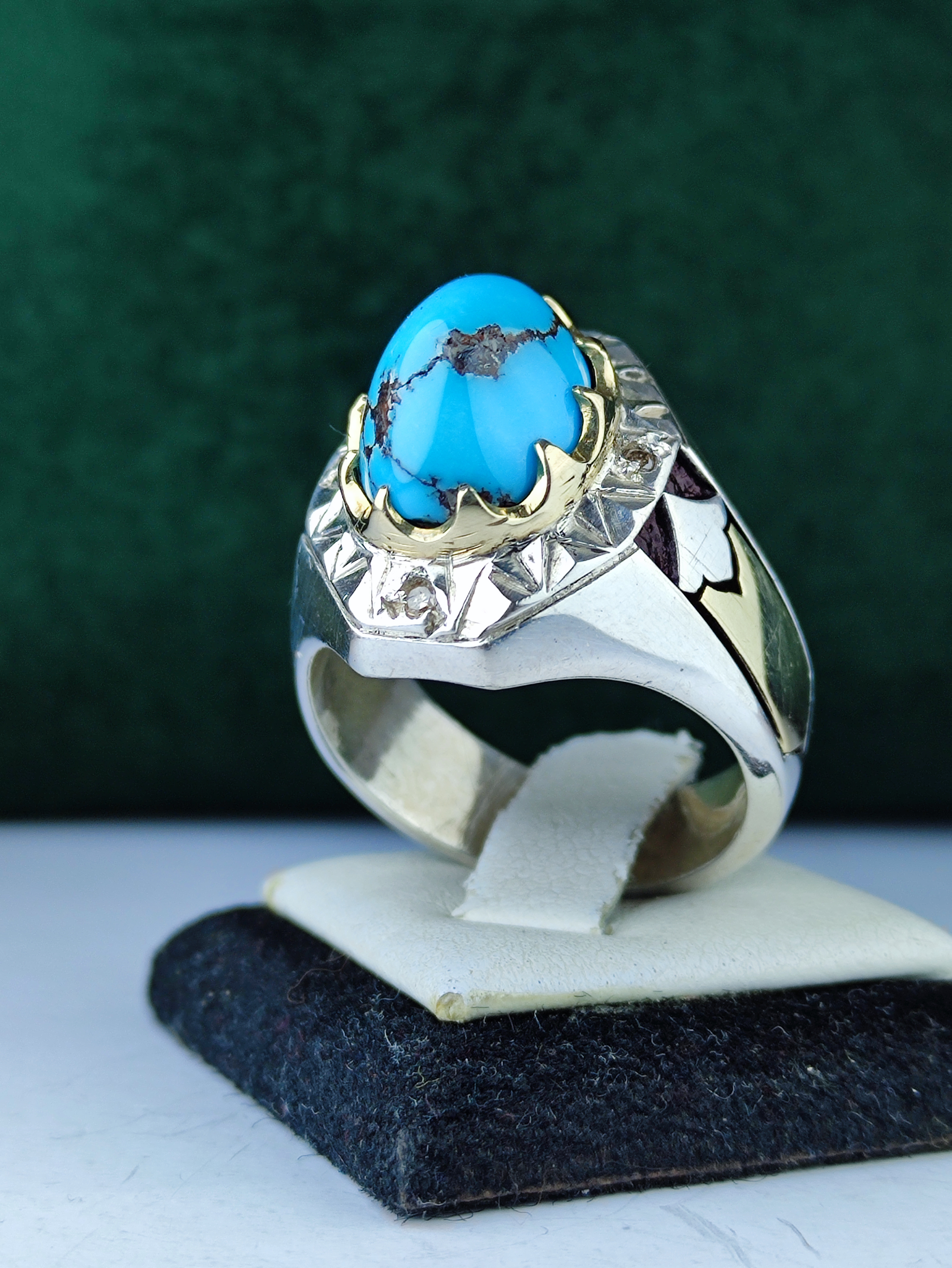 با انگشتر نقره فیروزه نیشابور اصل، جلوهای از هنر دستساز ایران را به انگشتان خود بیاورید! این انگشتر با سنگ فیروزه نیشابور اصیل و چهار قطعه برلیان درخشان ترکیب شده و رکاب فیلی چنگی آن با دقت و ظرافت بینظیر ساخته شده است. انتخابی لوکس و خاص برای آنهایی که به دنبال زیباییهای منحصر به فرد هستند!