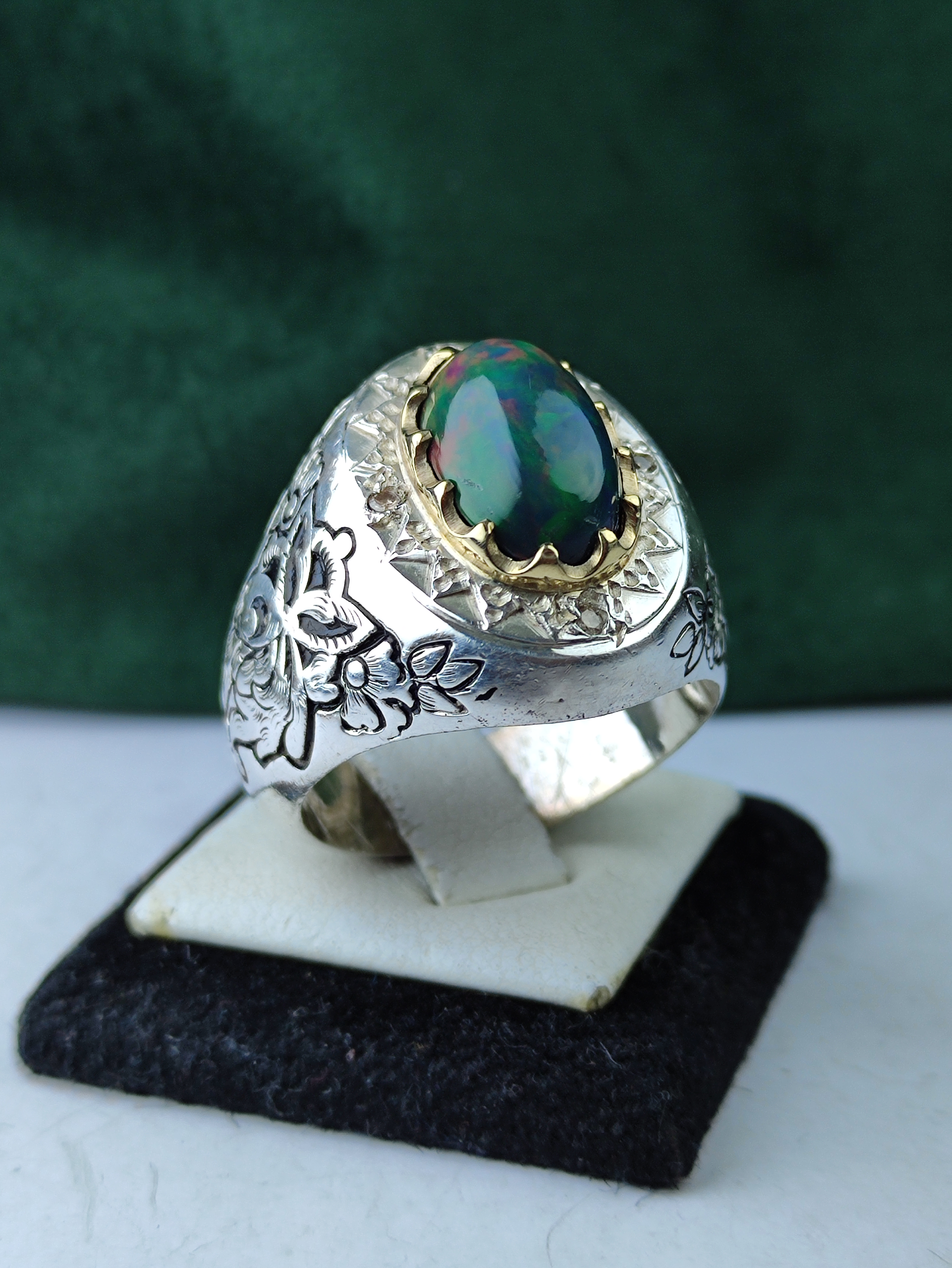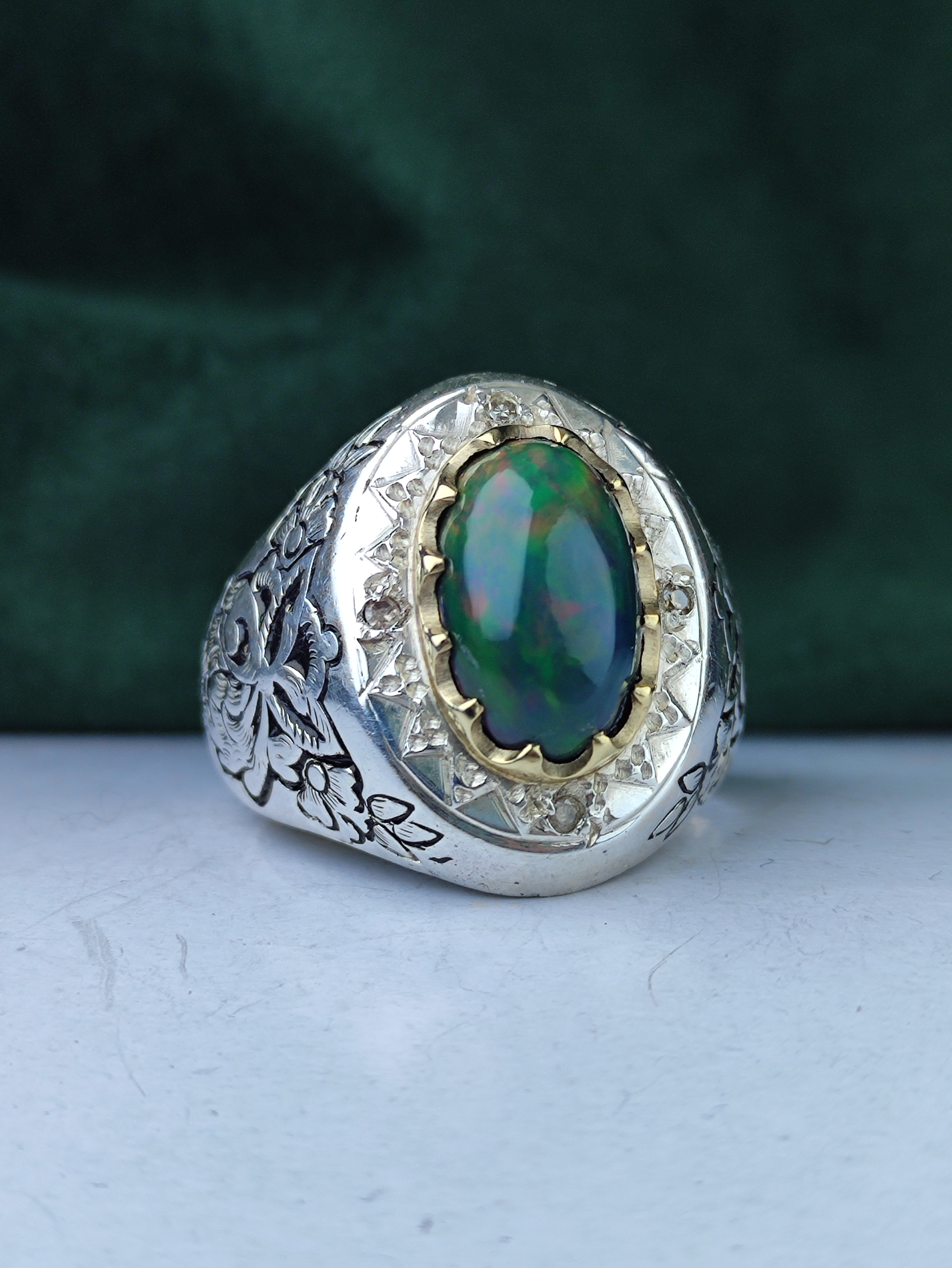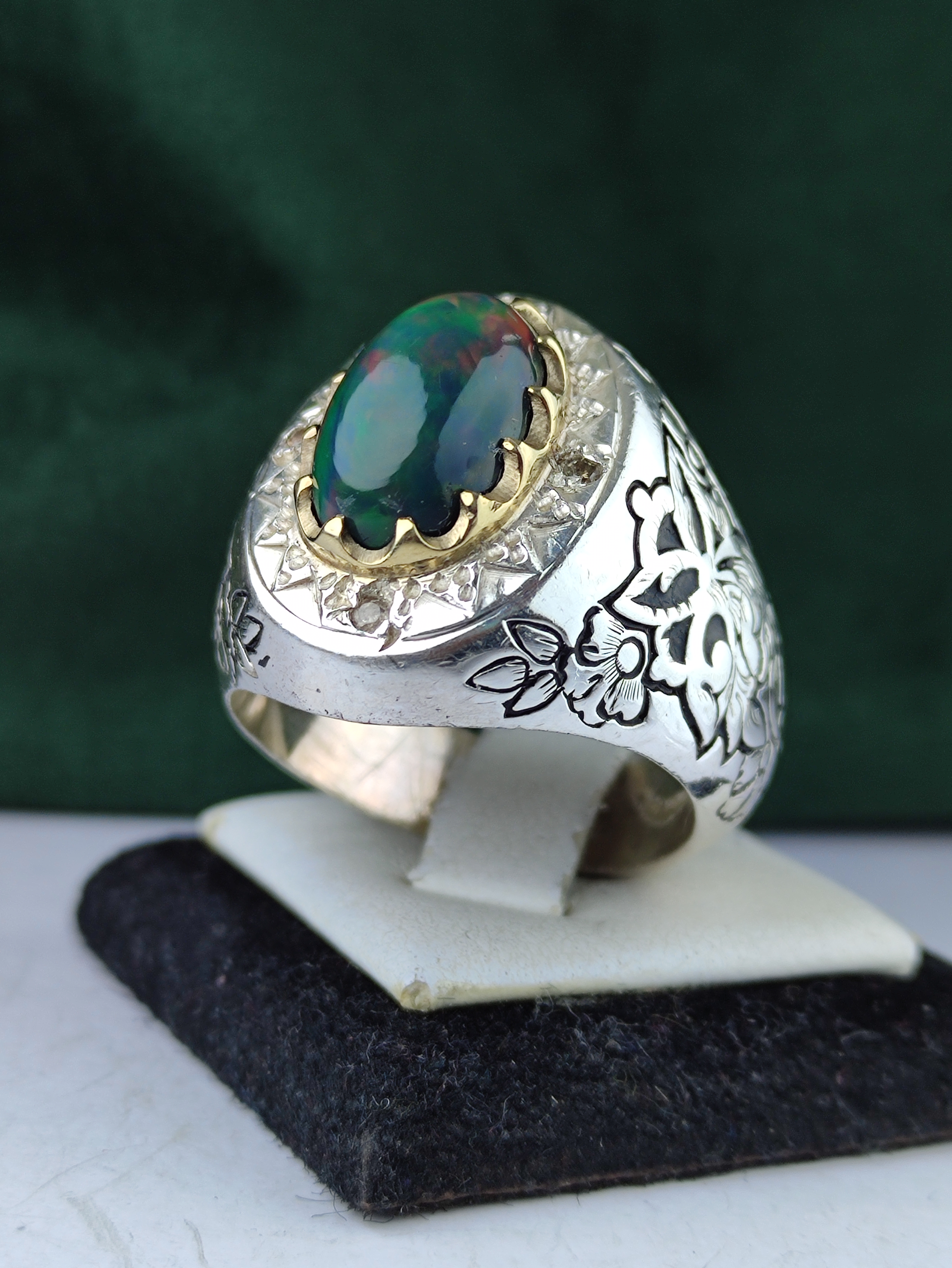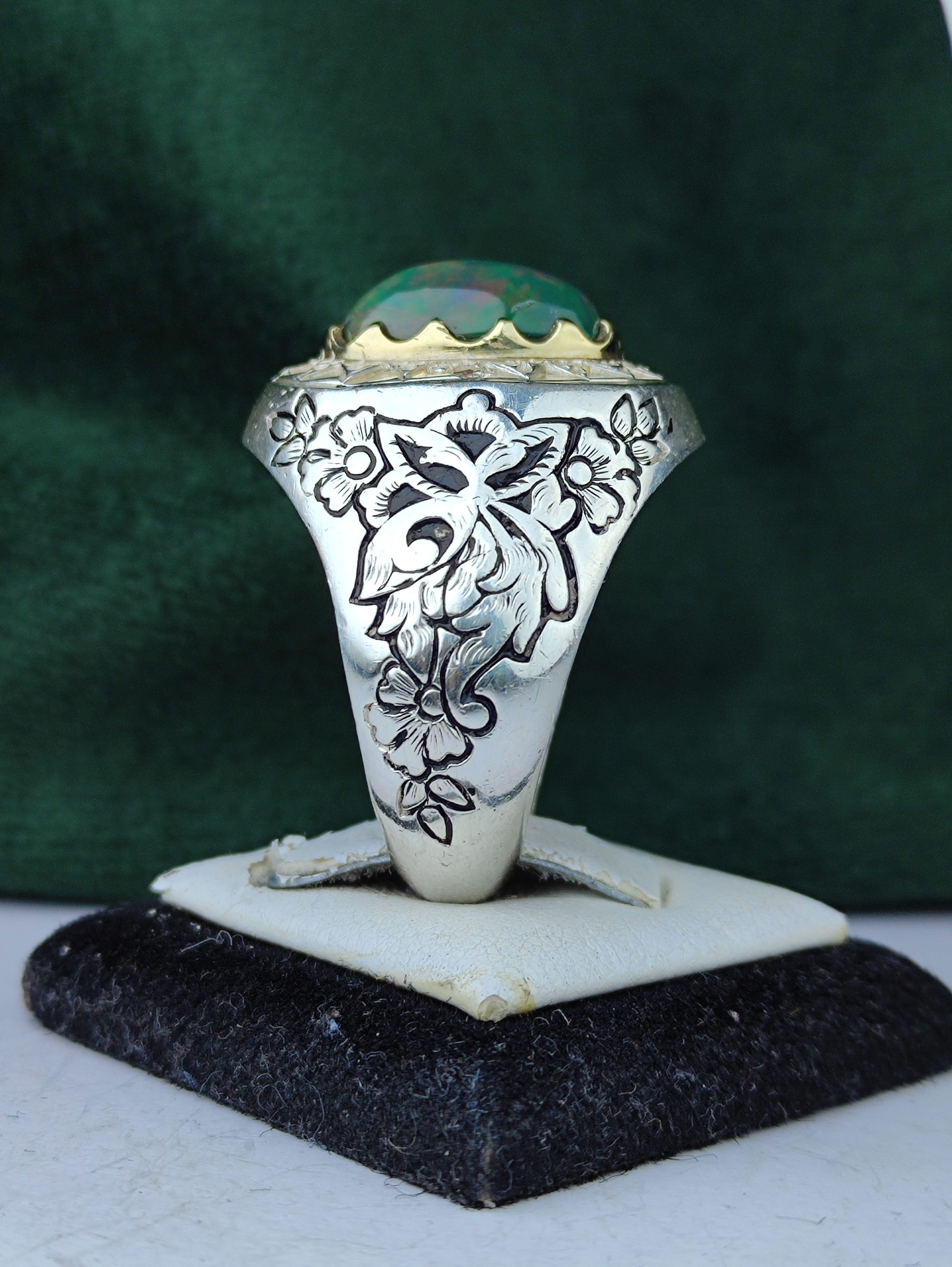 انگشتر نقره اپال اتیوپی اصل با تلألو سبز و قرمز رکاب فیلی چنگی دست ساز شبکه و آینه کاری شده