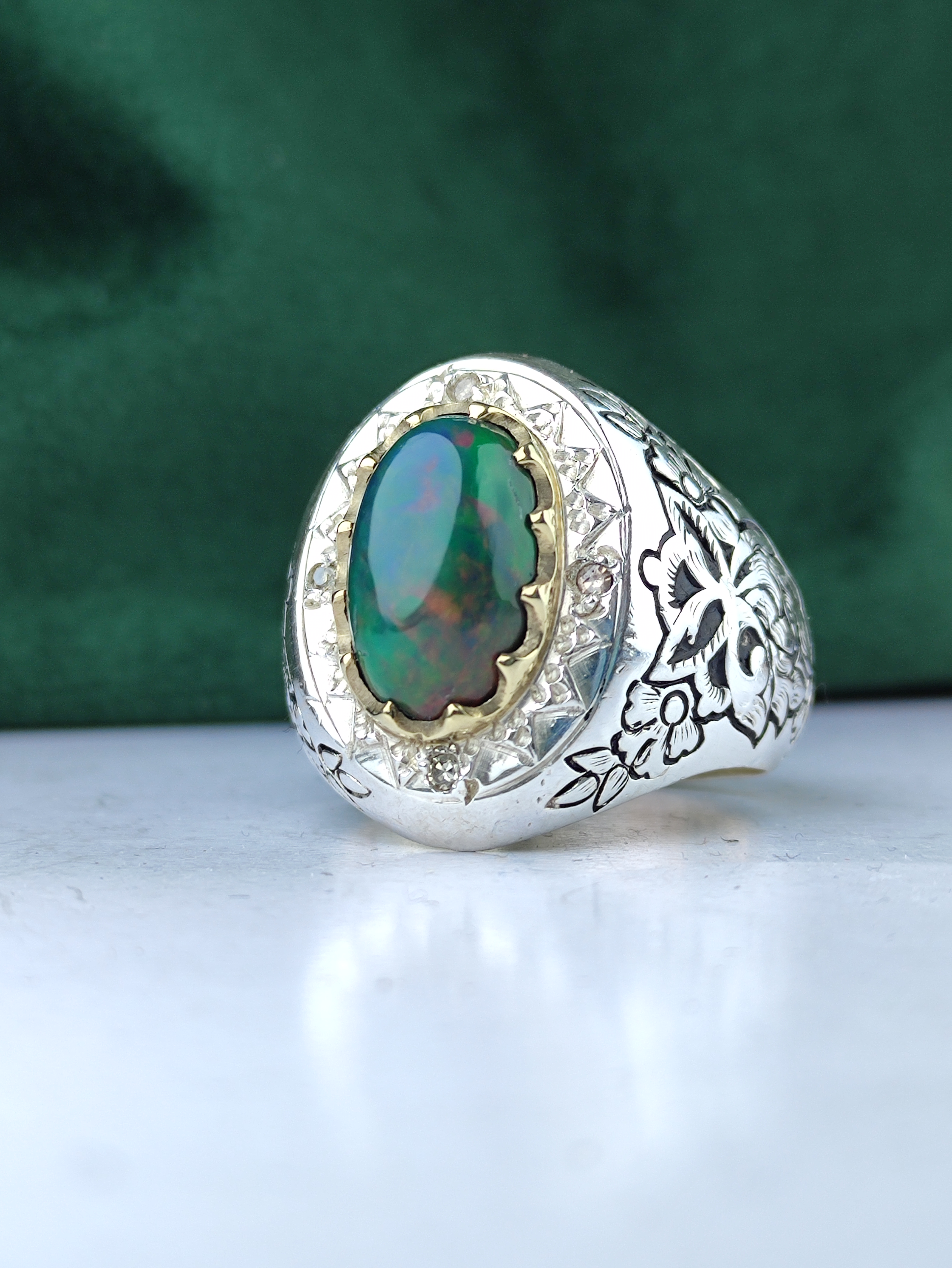 انگشتر نقره اپال اتیوپی اصلی با تلألو سبز و قرمز مخراج چهار قطعه برلیان اصل رکاب فیلی چنگی دست ساز