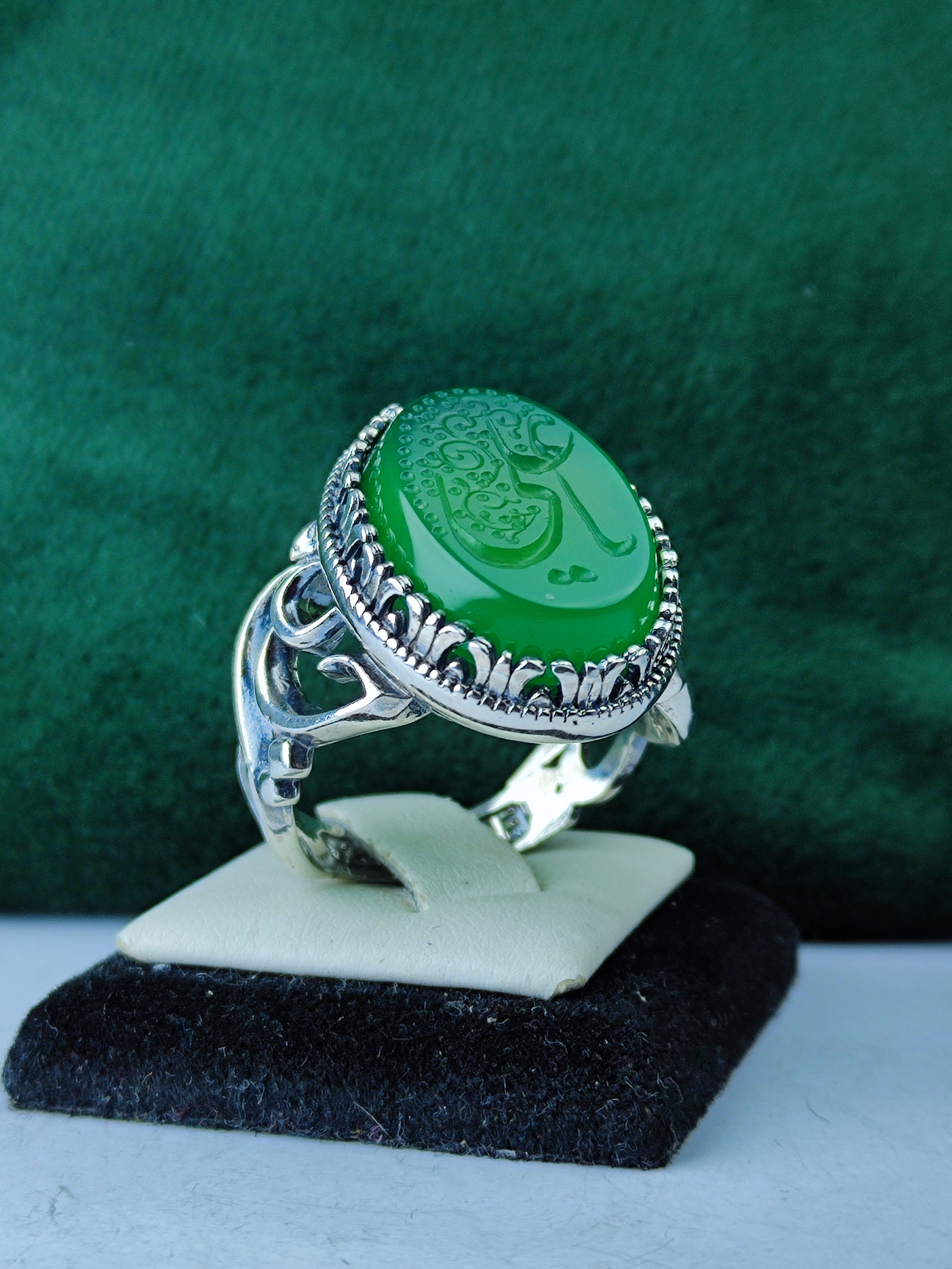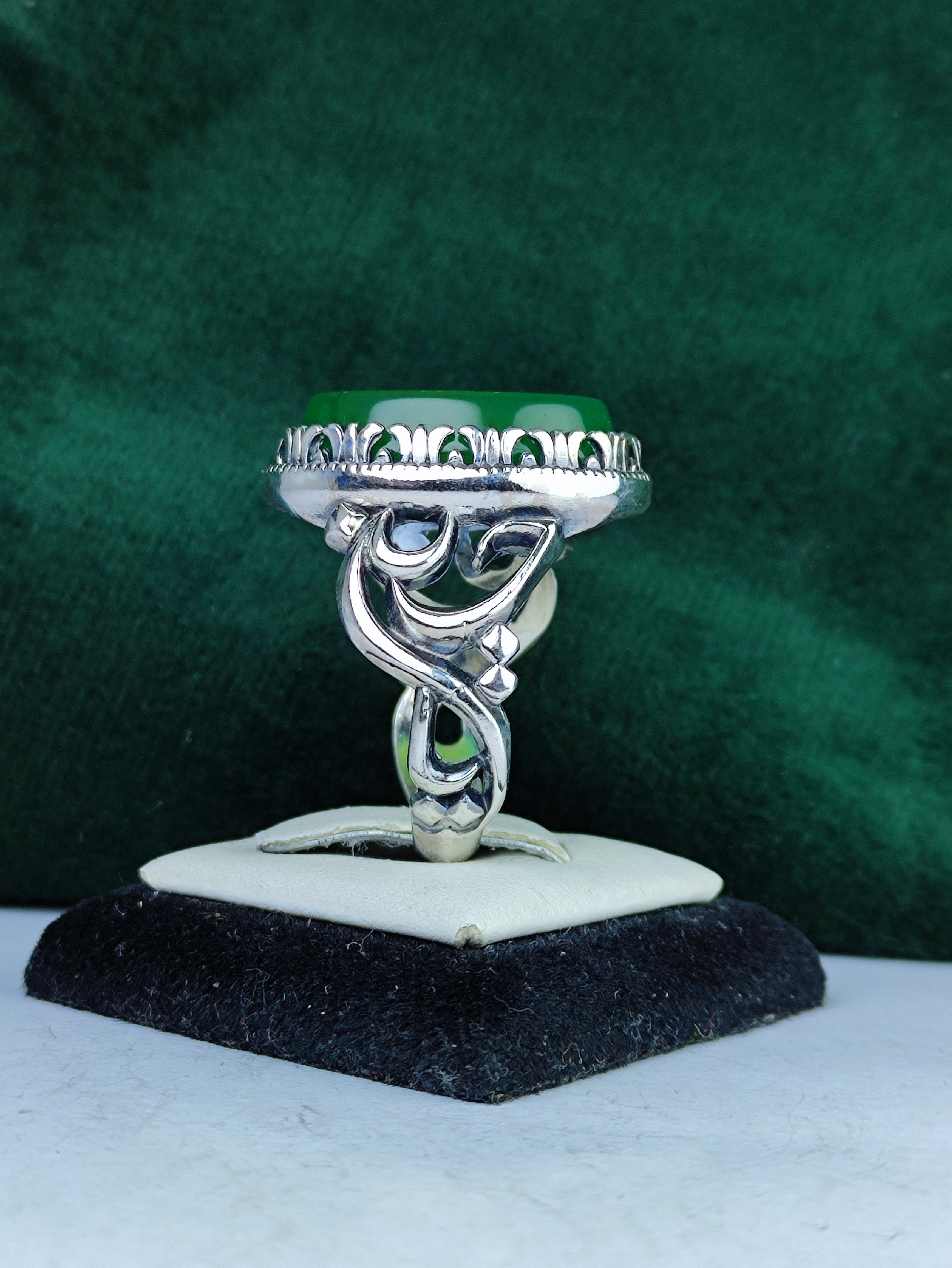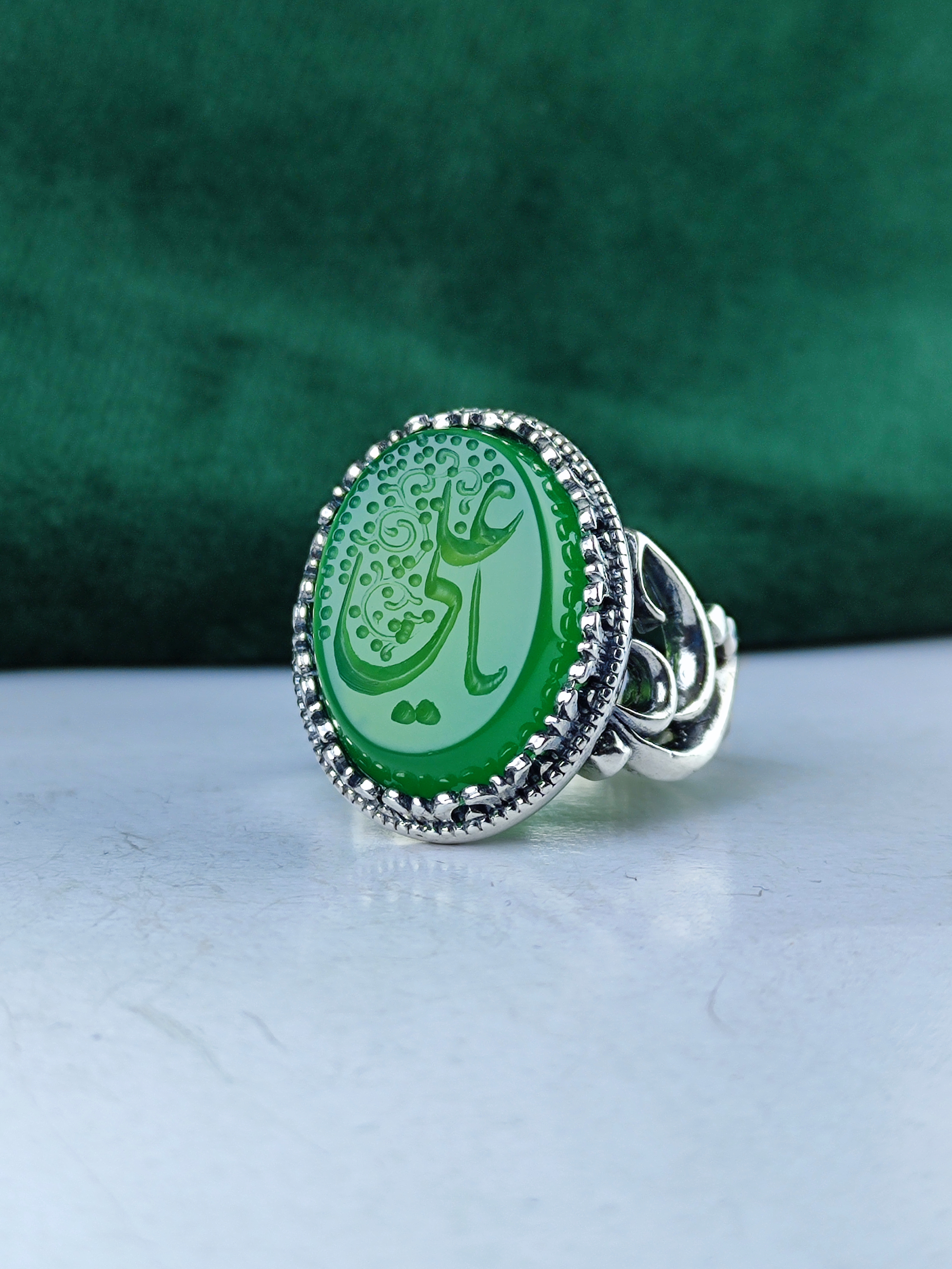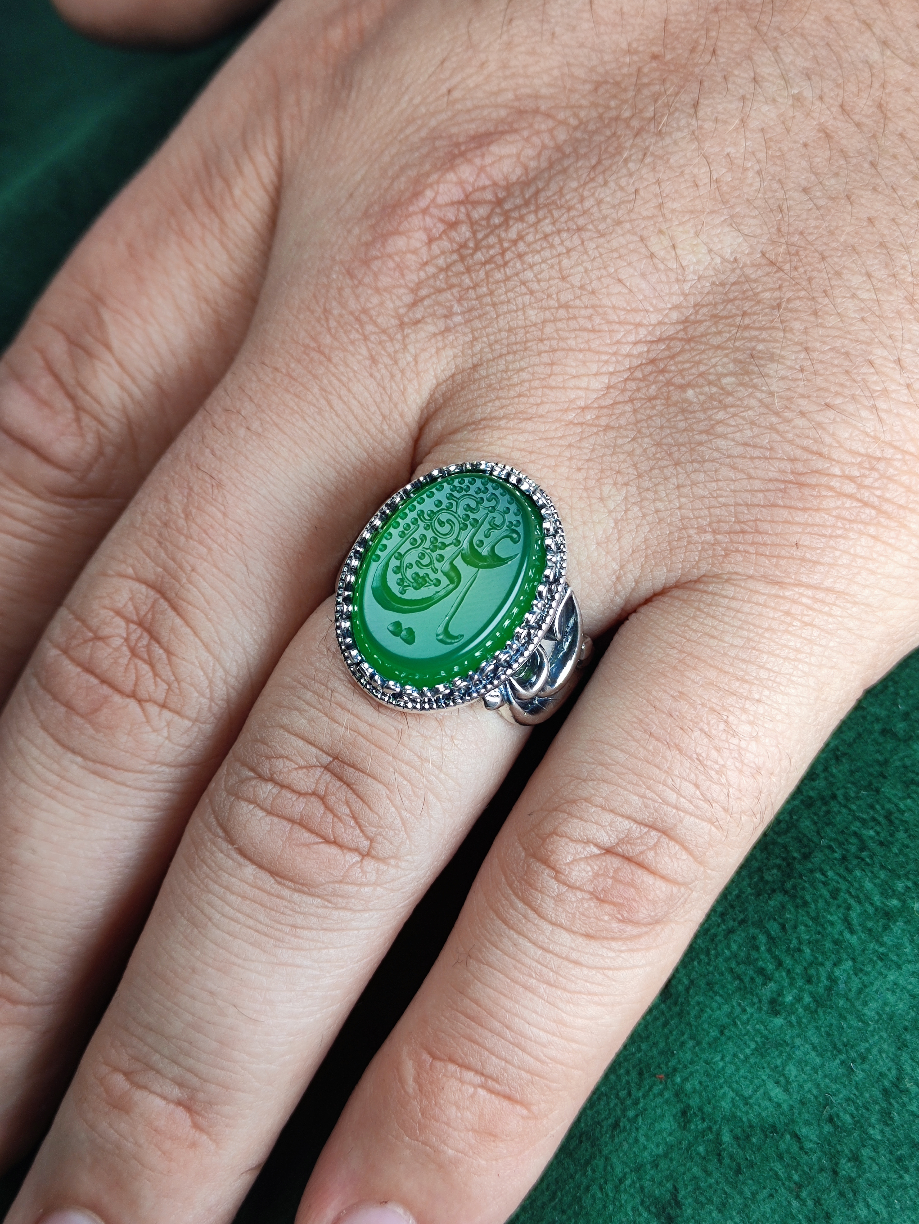 با انگشتر نقره عقیق سبز، جلوهای از زیبایی و ایمان را به دستان خود بیاورید. این انگشتر با حکاکی خاص "یا علی (ع)" و رکاب چنگی با طرح "یا حسین (ع)"، نمادی از ارادت و عشق شماست. طراحی ماشینی دقیق و سنگ عقیق سبز، هر نگاه را مسحور میسازد. این انگشتر انتخابی بینظیر برای شماست، همین حالا خرید کنید و متحول شوید!