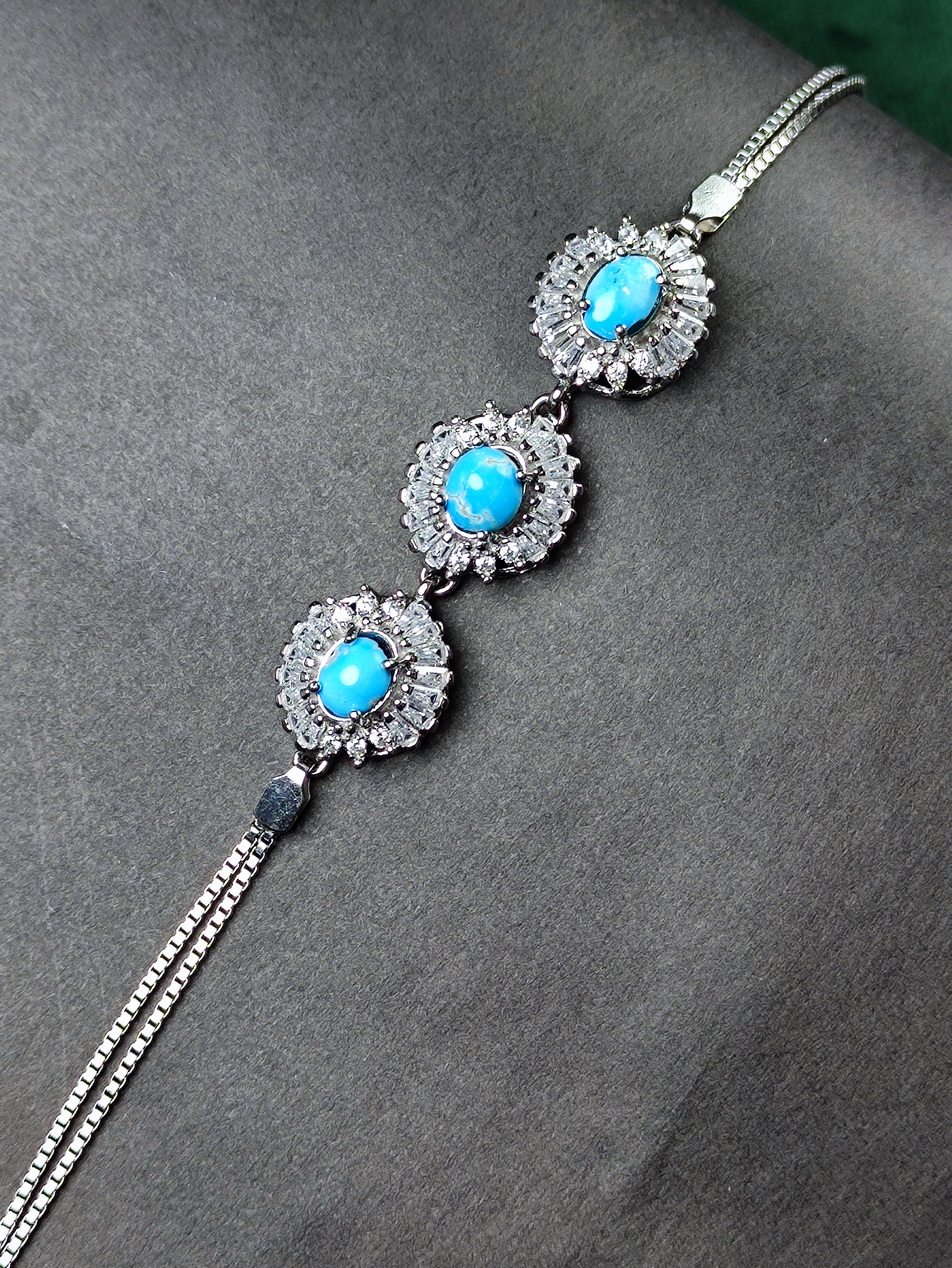 با دستبند نقره جواهری سه نگینه فیروزه نیشابوری اصل، زیبایی و شکوه را به دستان خود بیاورید! این دستبند با نگینهای فیروزه اصل و درخشان، ظاهری خاص و چشمنواز به شما میبخشد. کیفیت بینظیر و طراحی منحصربهفرد، این محصول را به انتخابی ایدهآل برای خاصپسندان تبدیل کرده است. همین حالا جلوهای بینظیر به استایل خود ببخشید!