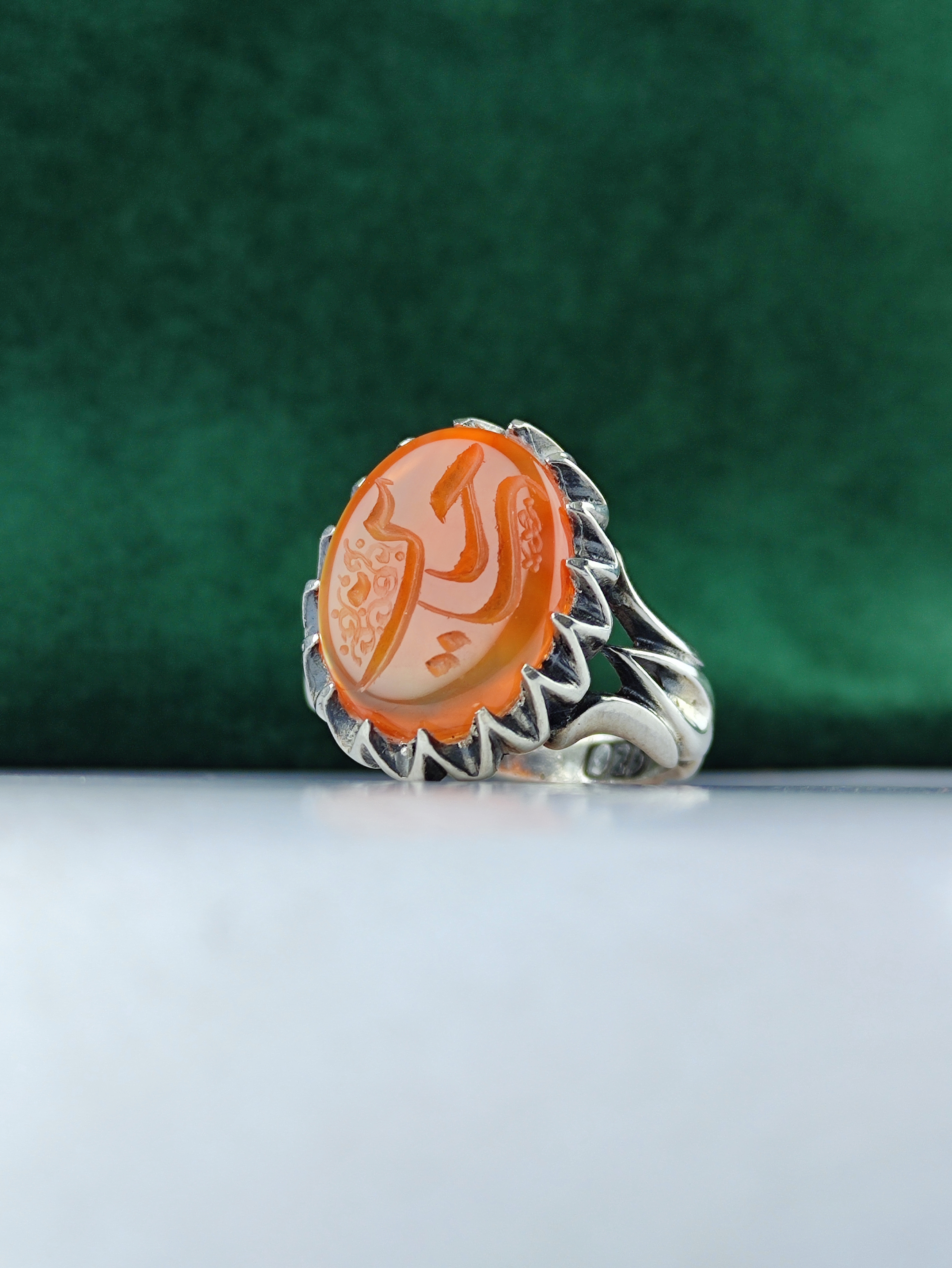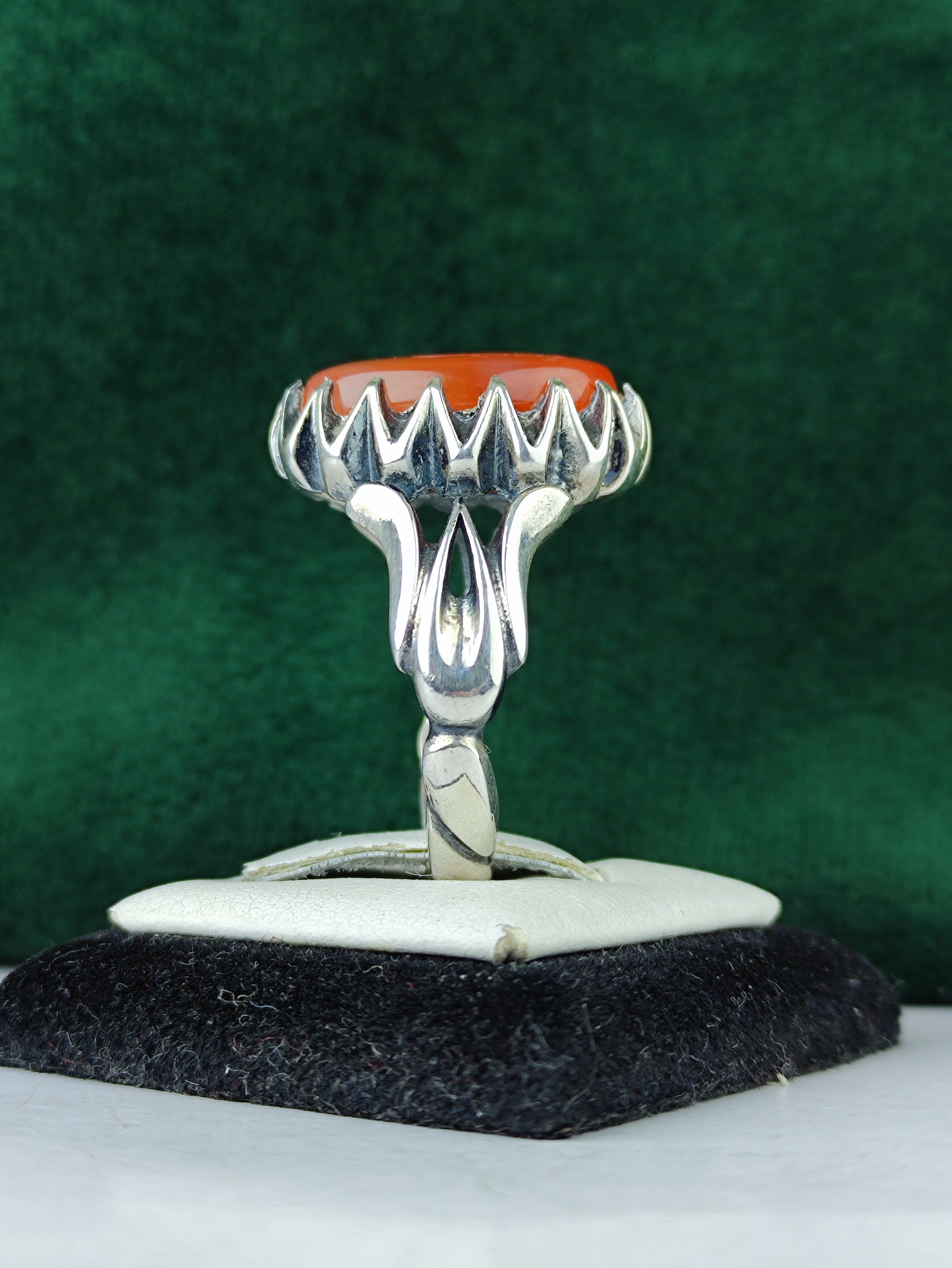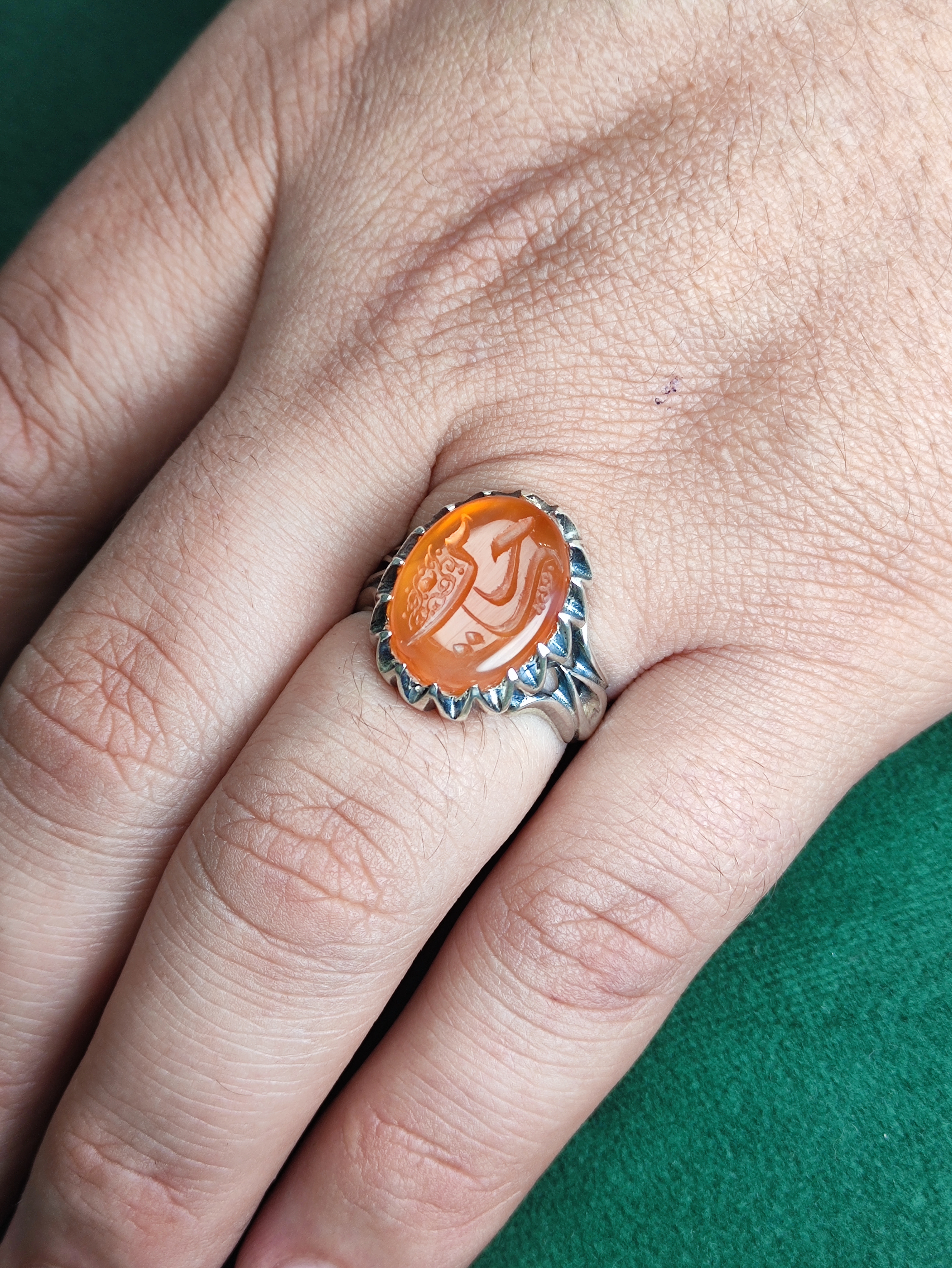انگشتر نقره عقیق یمنی اصل، با حکاکی معنوی "یا حسین (ع)"، زیور باشکوهی است که معنویت و زیبایی را در دست شما تلفیق میکند. رکاب صفوی چنگی این انگشتر، با دقت و ظرافتی ماشینکاری شده، نمادی از اصالت و هنر ایرانی است. این جواهر نفیس، انتخابی بینظیر برای هدیه به خود یا عزیزانتان است و شکوه را به استایل شما میافزاید.