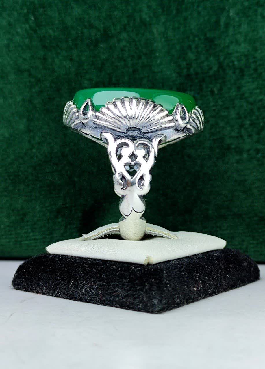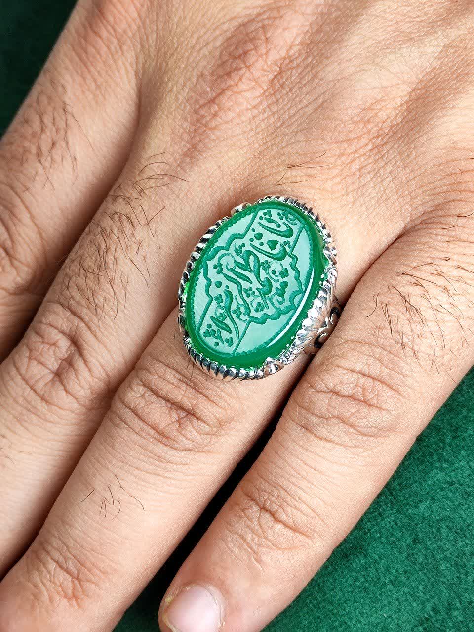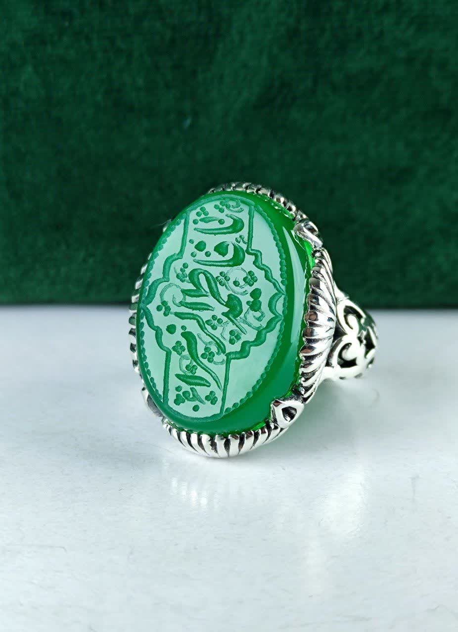 انگشتر نقره عقیق سبز "یا فاطمة الزهرا (س)" با رکاب صفوی چهار چنگ اشکی، تجسمی از هنر و اصالت است. این جواهر زیبا و معنادار با طراحی ماشینی دقیق، زیبایی و معنویت را به دستان شما هدیه میدهد. با این انگشتر منحصر به فرد، جذابیت و شکوه را به استایل خود بیاورید و از انرژی مثبت آن بهرهمند شوید.