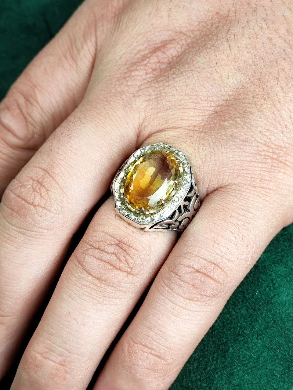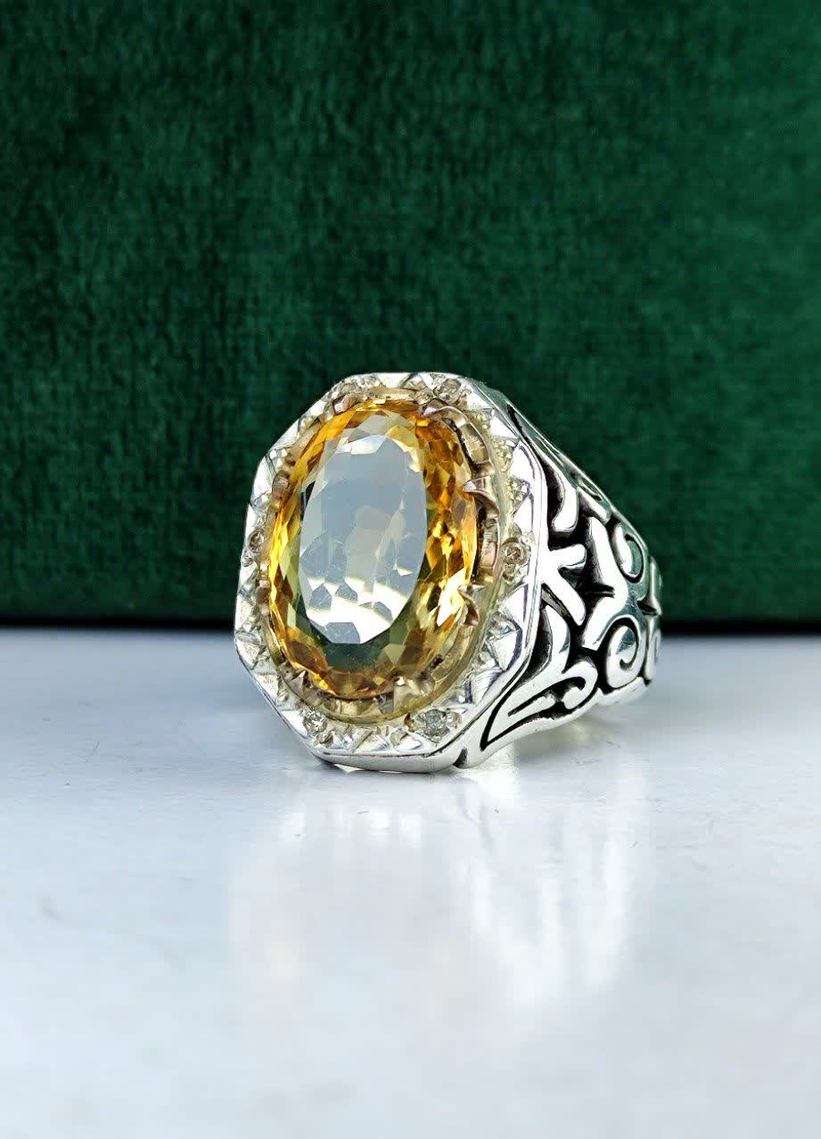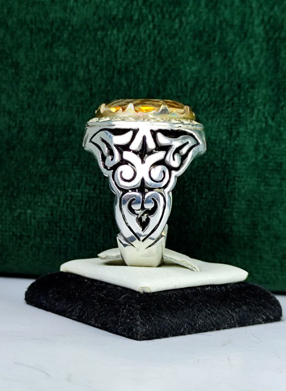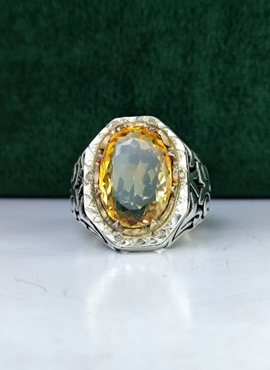 انگشتر نقره سیترین طلایی اصل مخراج شش قطعه برلیان اصل رکاب فیلی چنگی دست ساز آینه کاری شده