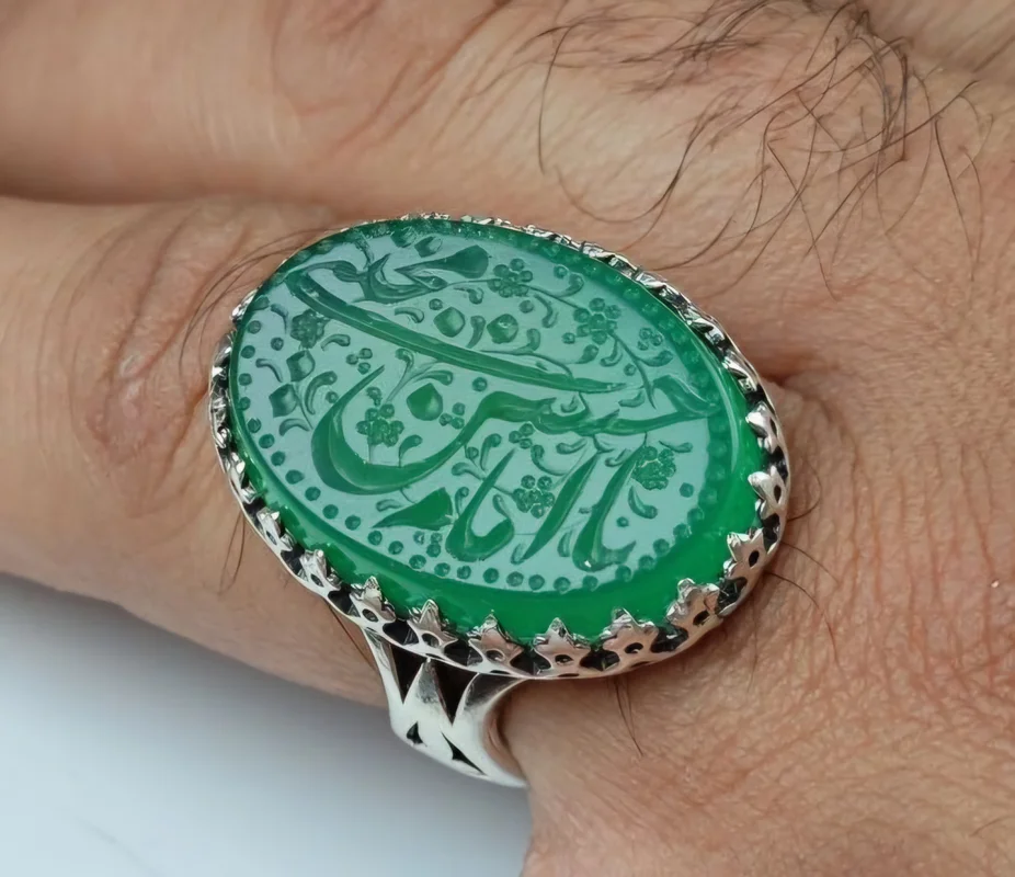 انگشتر نقره عقیق سبز خطی حکاکی یا امام حسن مجتبی رکاب نیزه