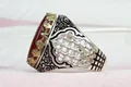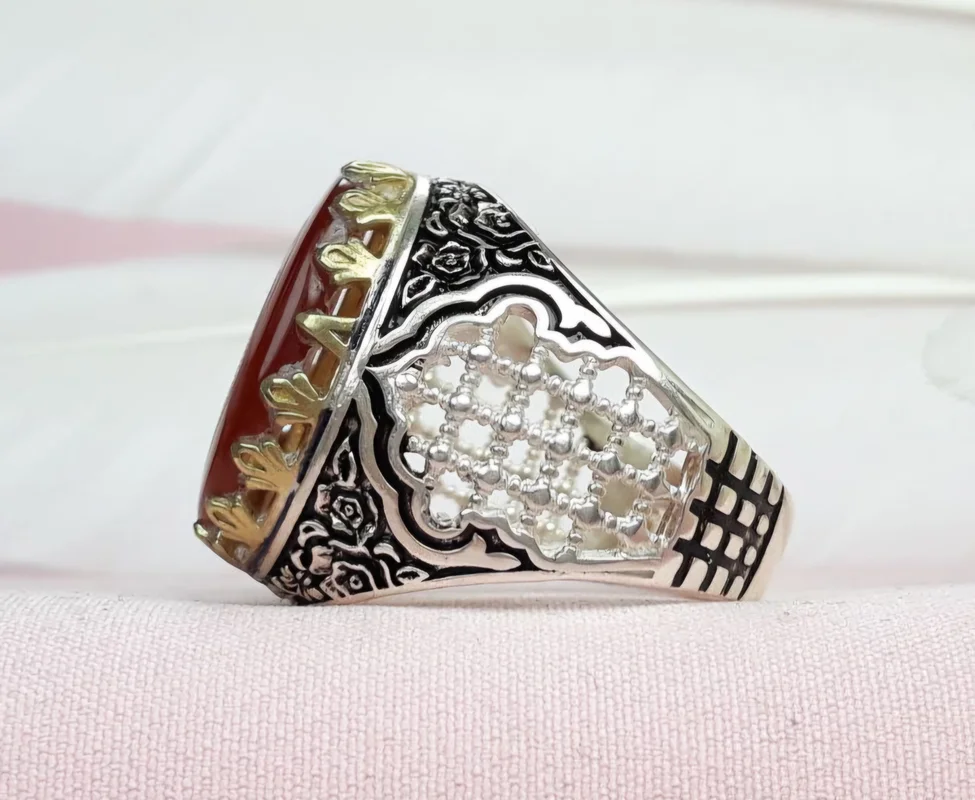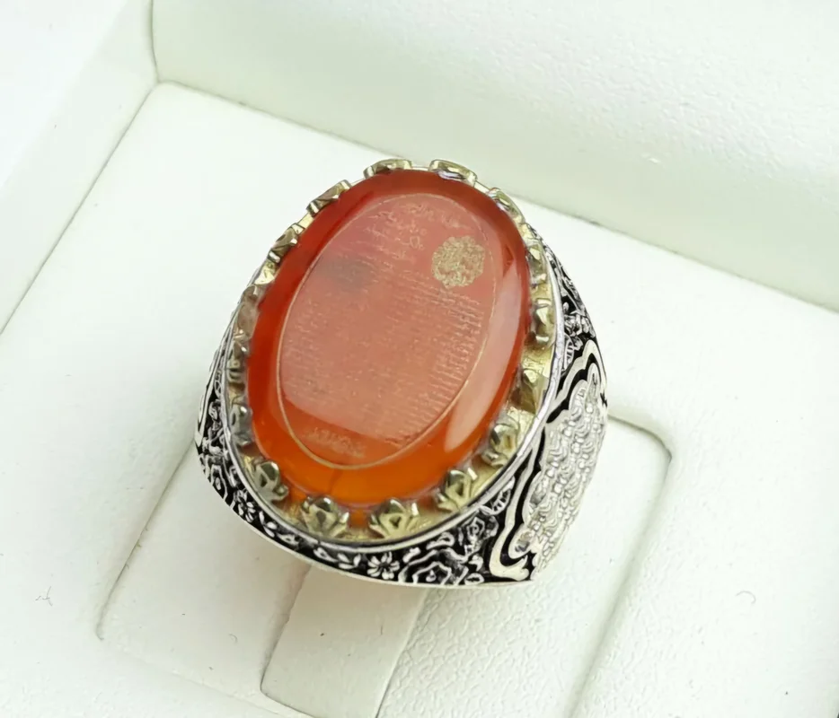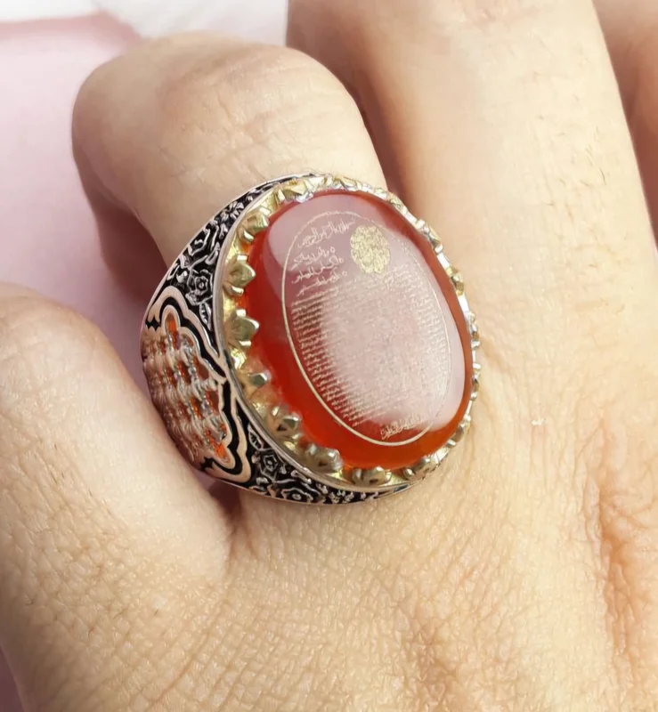 انگشتر نقره عقیق سرخ یمنی خطی حکاکی لیزری سوره یس پشت نگین حرز کبیر امام جواد(ع) رکاب تاج برنجی بغل طرح ضریح