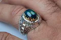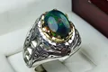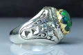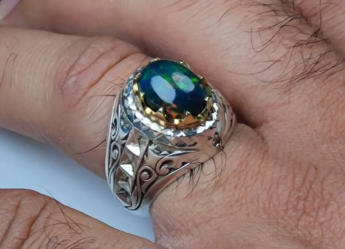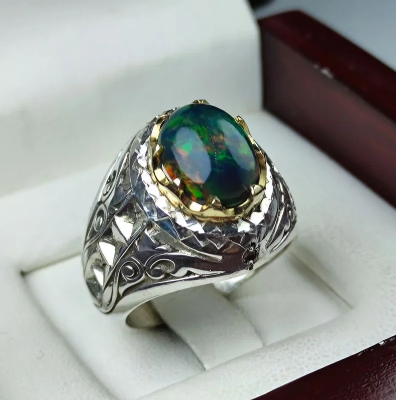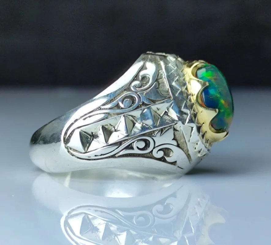 انگشتر نقره اپال اتیوپی اصل با تلألو سبز و قرمز رکاب فیلی چنگی دست ساز شبکه و آینه کاری شده