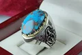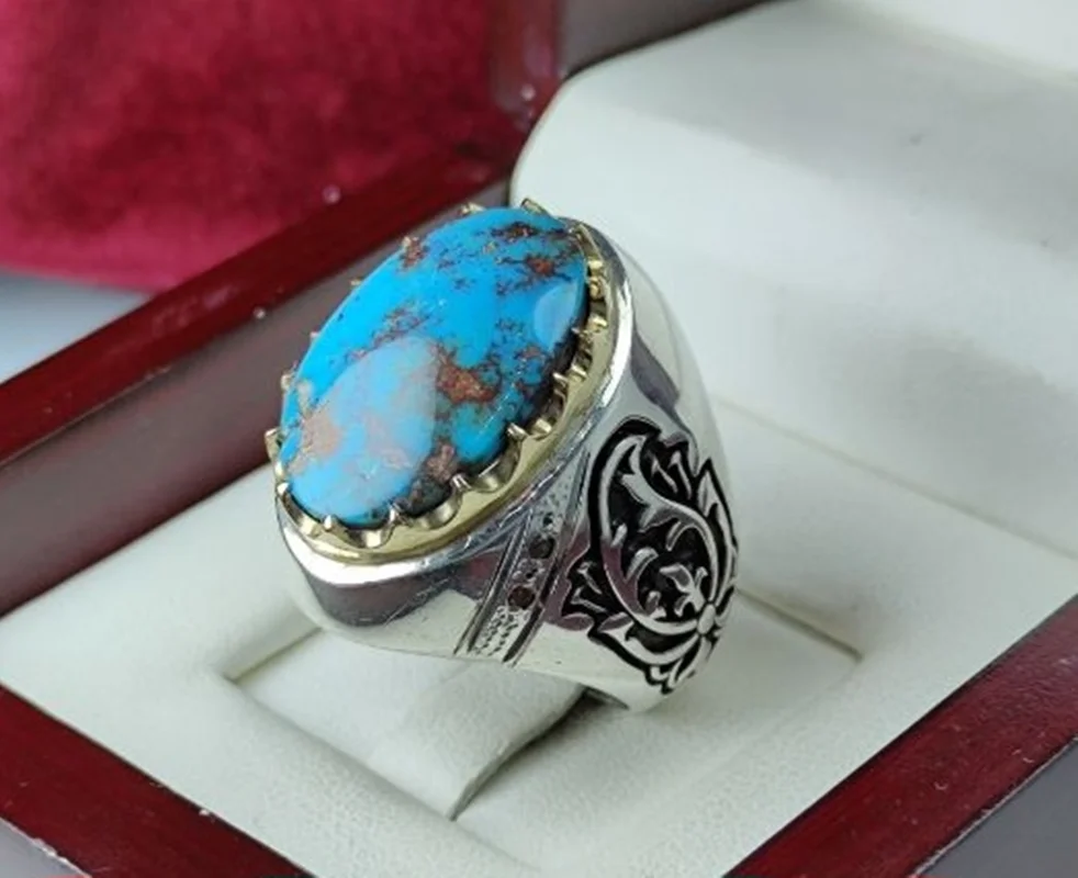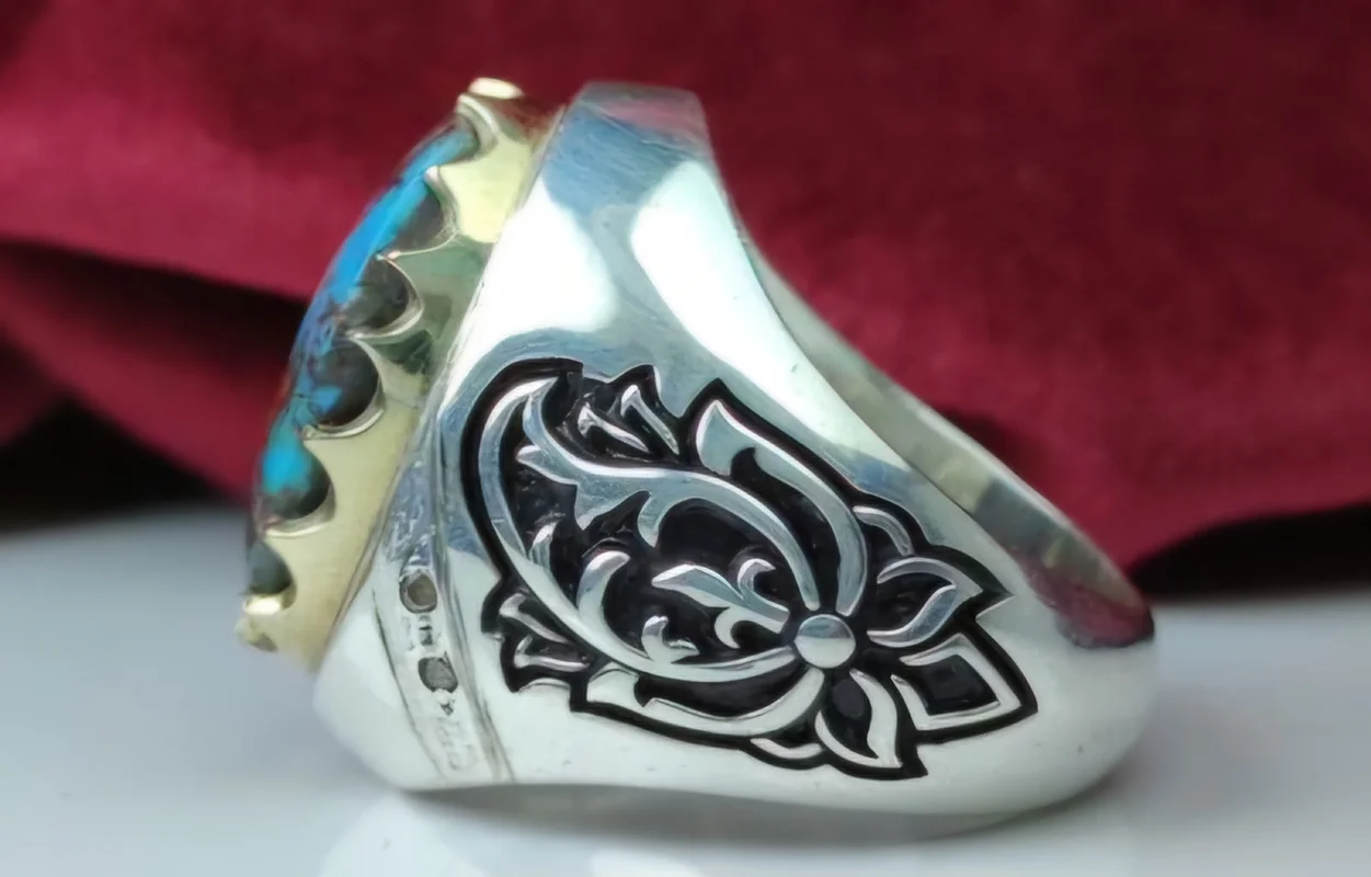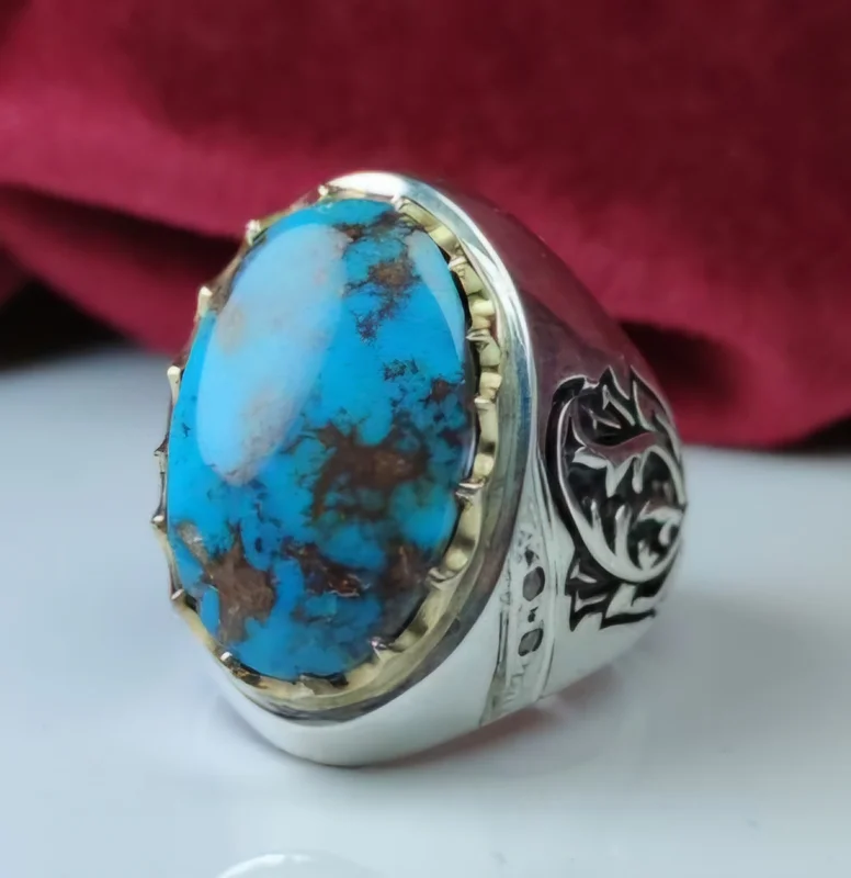 انگشترنقره فیروزه نیشابوری اصل رکاب دست ساز تاج برنجی اثر استاد احمدی