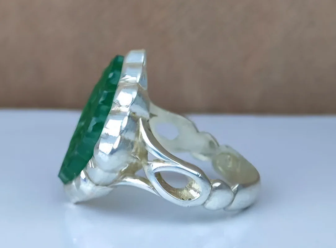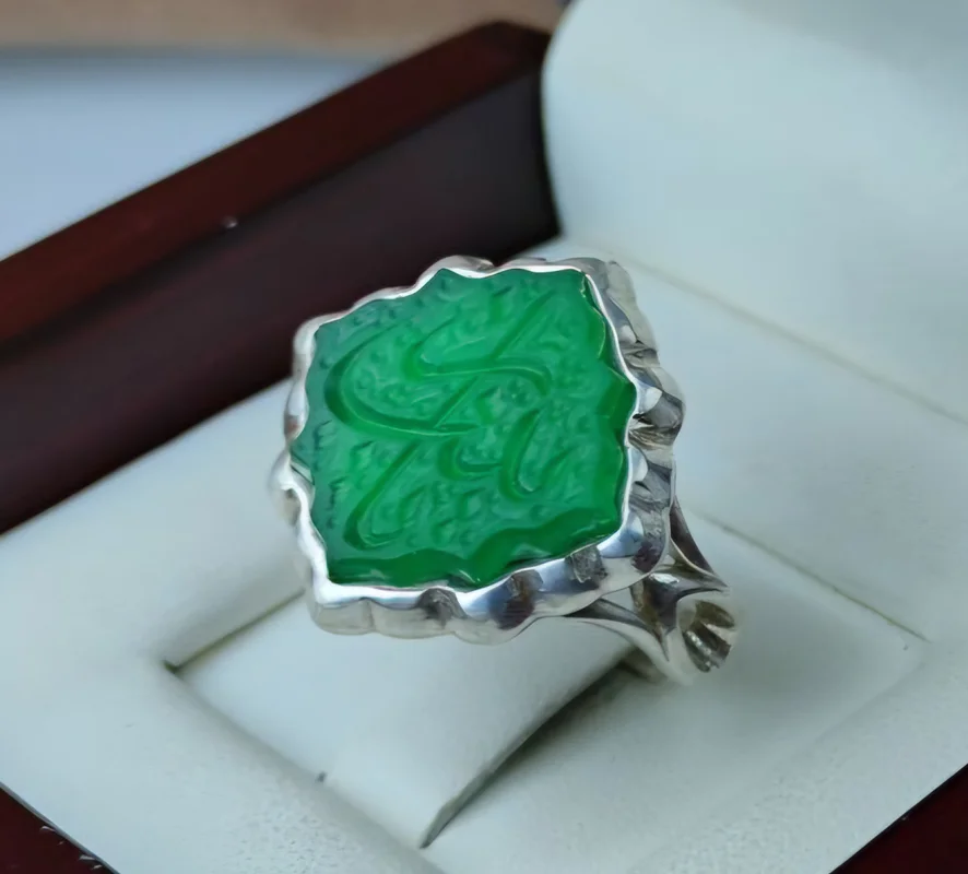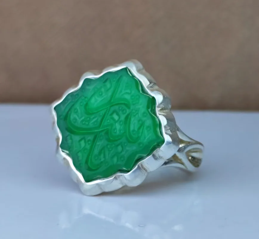 انگشترنقره عقیق سبز خطی حکاکی یا زینب اثر استادفاضل زاده رکاب شمسه